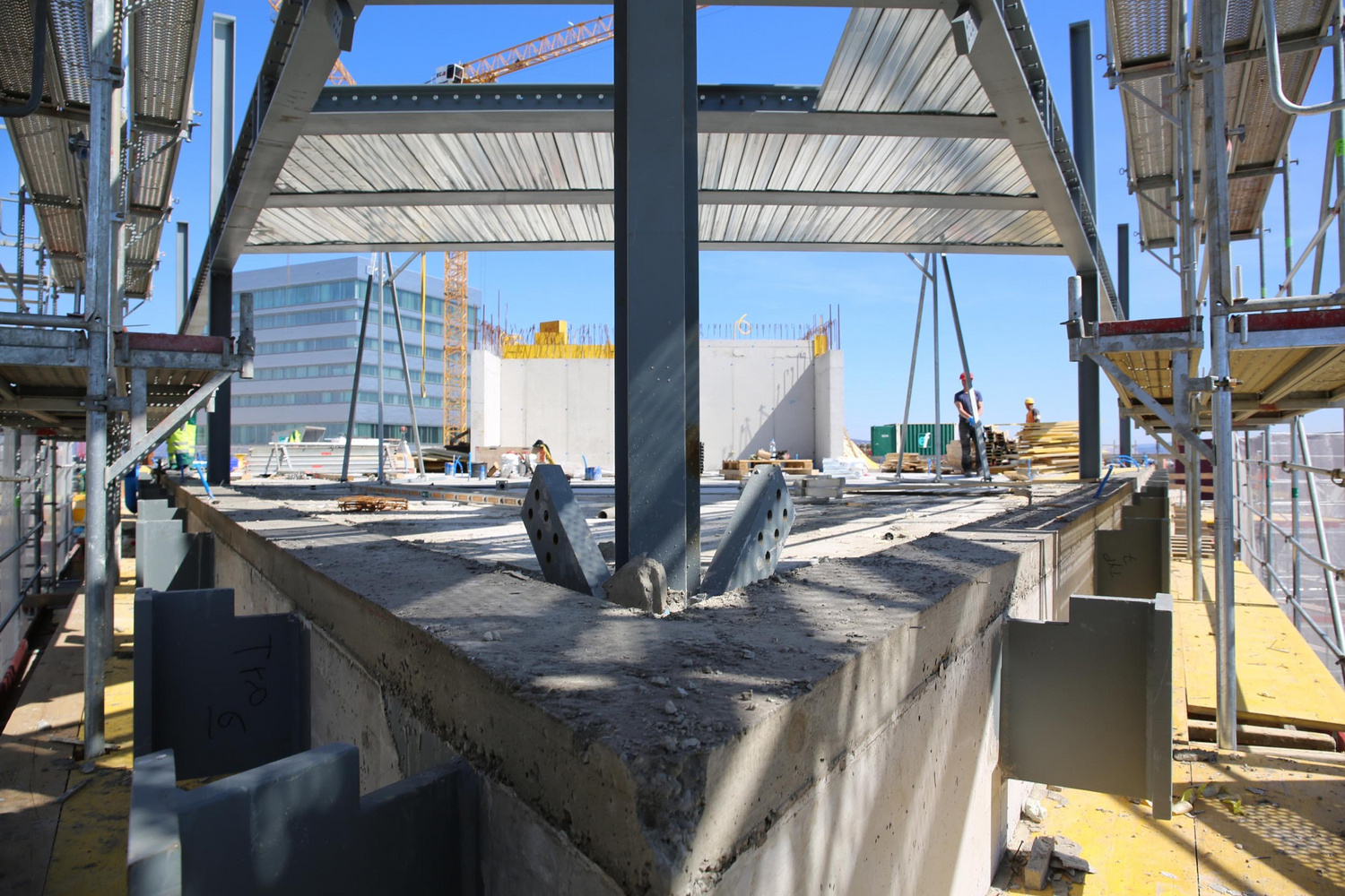 Eine statische Besonderheit wiesen die kopfseitig angeordneten, grossen Auskragungen auf. Mit Hilfe einer 3-geschossigen Fachwerkkonstruktion an den Gebäudeenden wurden die Lasten der Auskragung “zurückgehängt”, um eine zusätzliche Spannung des Baukörpers zu erreichen. In den Bereichen der Auskragung wurden die Decken zur Minimierung der Lasten als Stahl-Beton-Verbunddecken ausgebildet.