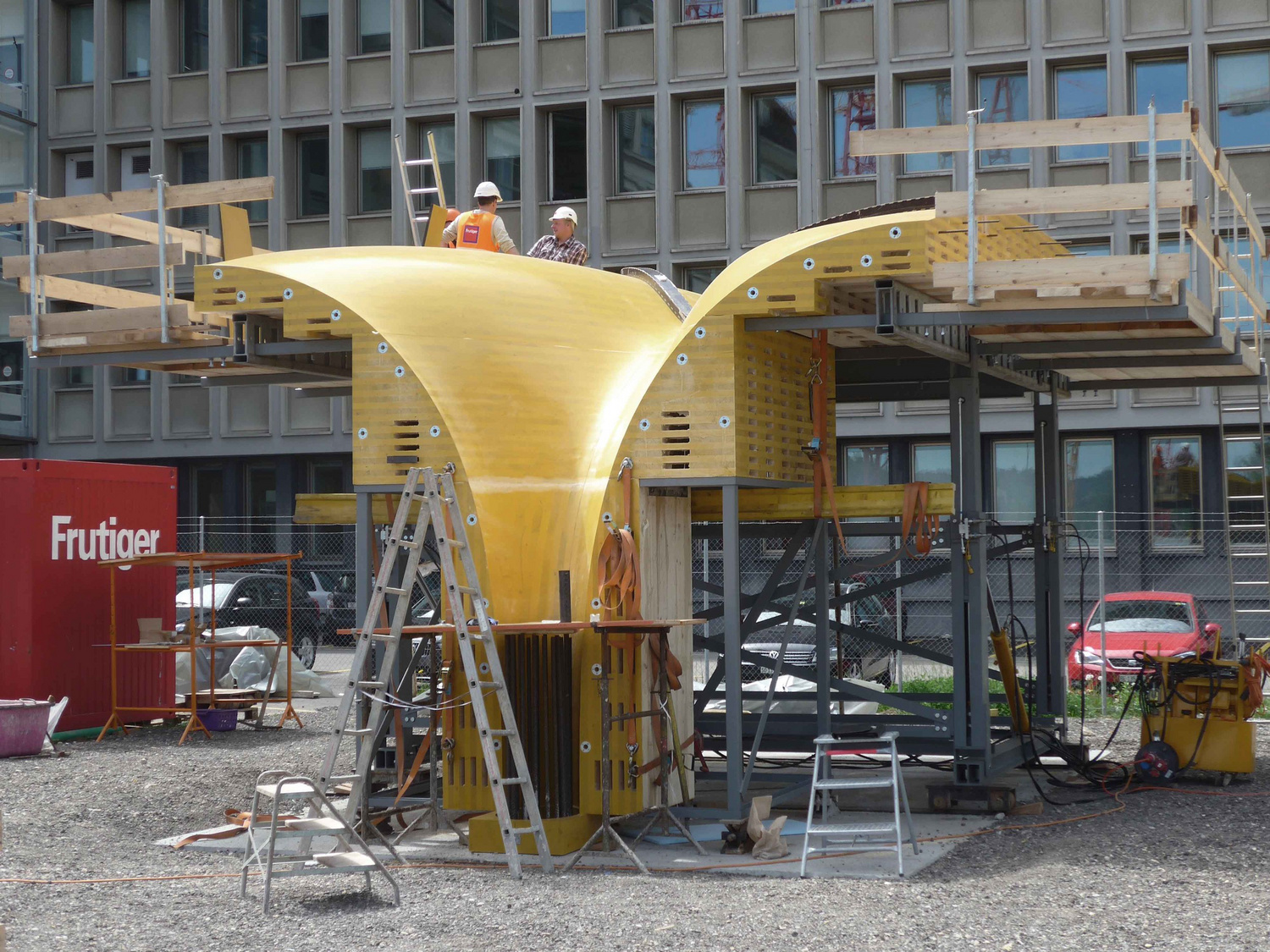Das Entwickeln der Form der Gewölbestruktur startete mit einem architektonischen Entwurf. Dieser sollte die Grundidee des Architekten und Pritzker Preisträgers Shigeru Ban aufzeigen, wonach ein fünfgeschossiger Holzbau auf einem massiven Sockel aus Stahlbeton steht.