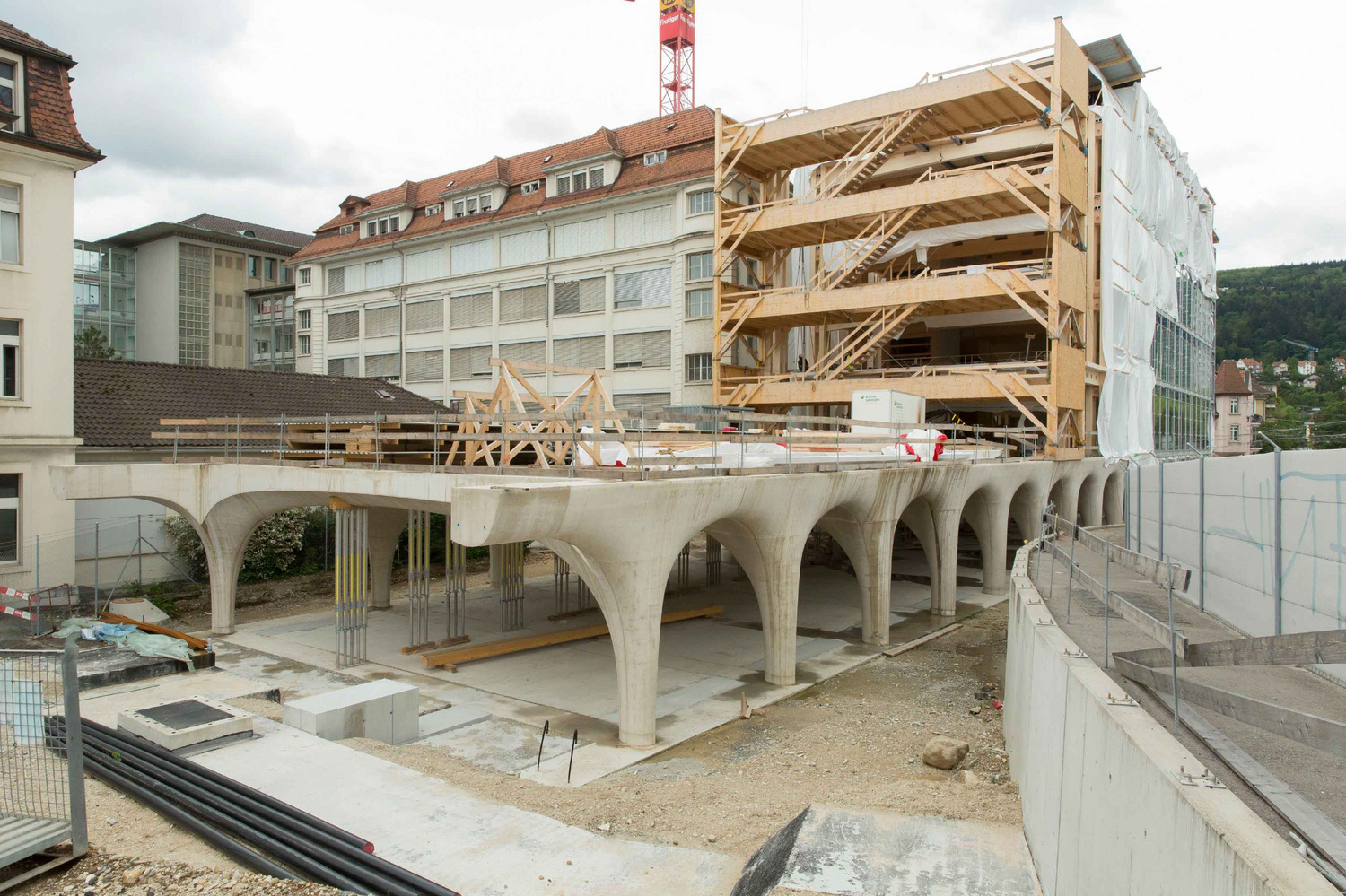 Mit der Cité du Temps haben die Marken Swatch und Omega ein neues und repräsentatives Museumsgebäude in Biel erhalten. Der siebengeschossige Hybridbau besteht aus fünf Obergeschossen, einem Erd- und einem unterirdischen Technikgeschoss. Die Obergeschosse sind in Holzbauweise konzipiert und stehen auf einem gewölbeartigen Sockelgeschoss aus Stahlbeton, das teilweise ausserhalb der Gebäudehülle im kalten Bereich liegt und als öffentlicher Aufenthaltsbereich dient.