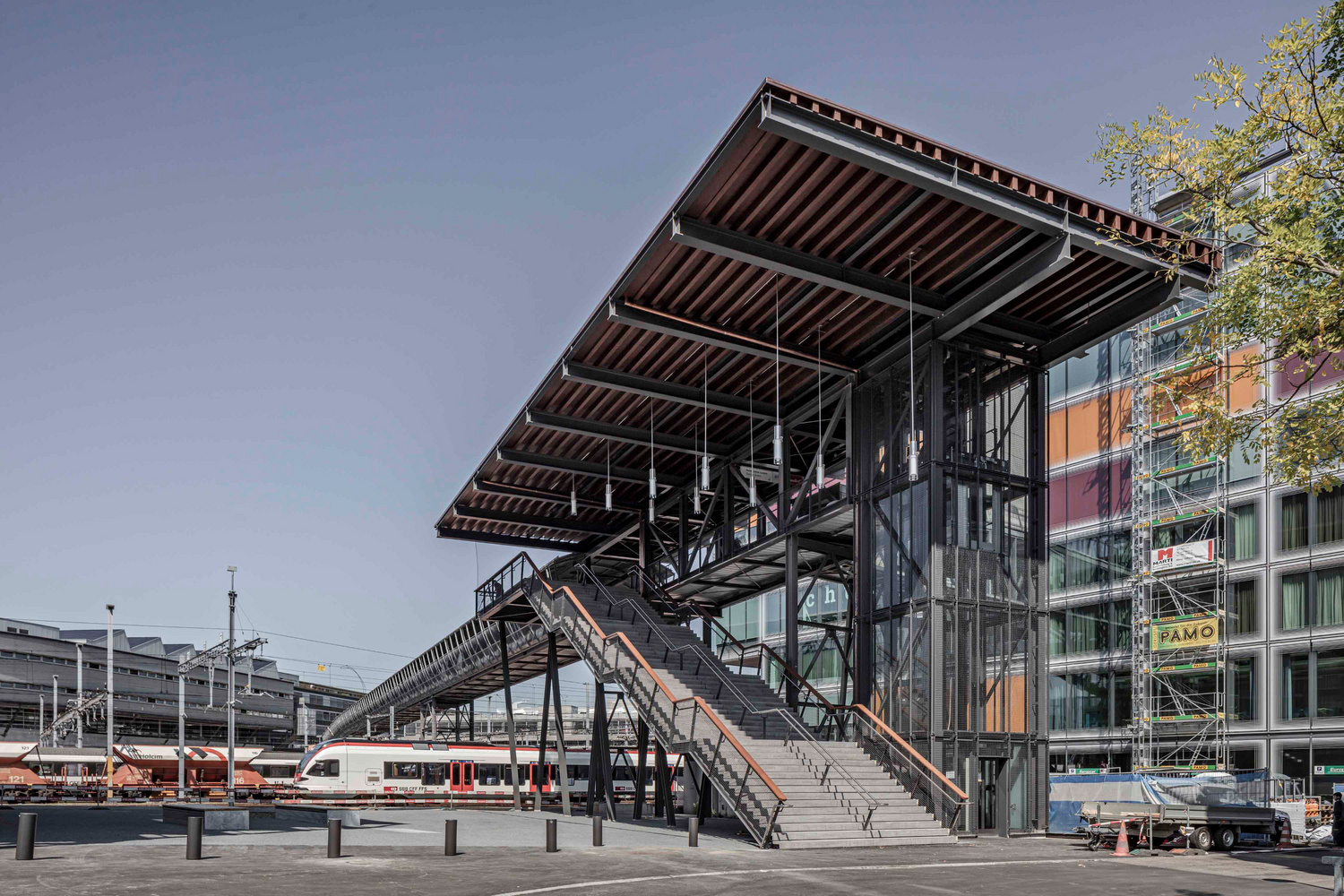 Der Zugang zum Bahnhof Luzern über den Frohburgsteg wurde im Rahmen der Entwicklung des Rösslimatt-Quartiers aufgewertet. Der neue Treppenaufgang verläuft parallel zur Passerelle mit einer Breite von ca. 5m und stützt sich auf fünf Zwischenabstützungen, welche rahmenartig ausgeführt sind. Die vertikalen Stahlträger weiten sich nach oben V-förmig auf, sodass infolge Änderung der Höhe eine Auffächerung der fünf Abstützungen entsteht. Zur Aufnahme der Vertikal- und Horizontallasten sind die Fundamente auf dem schlecht tragfähigen Untergrund auf Mikropfählen zu gründen. Die neue Struktur in Stahl und Holz setzt einen neuen Massstab für die Verbindung zwischen dem neuen Stadtbaustein und dem Bahnhofplatz. Die aufgewertete Passerelle steht im direkten Zusammenhang mit dem Erscheinungsbild des Gebäudes auf dem Baufeld A. Mit der Leichtigkeit der Treppe und dem ’fliegenden Dach’ wird der neue Passerellenkopf zum gelungenen Auftakt des Rösslimattquartiers.