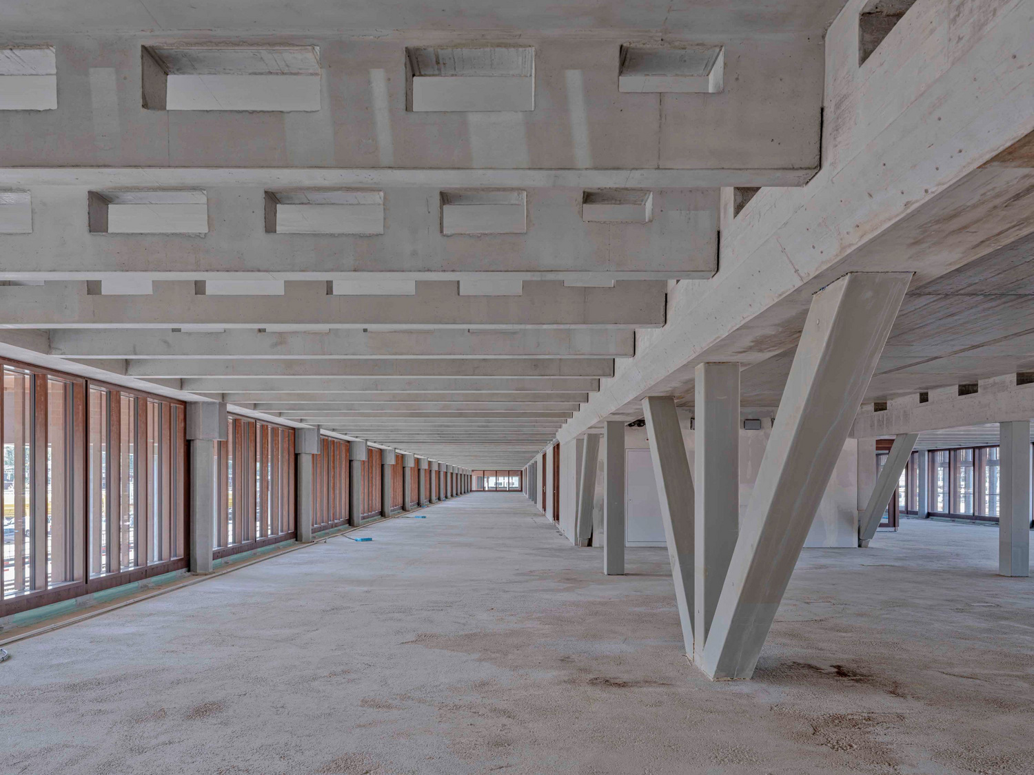 Das Bauen in unmittelbarer Nähe zu Bahngleisen stellte besondere Herausforderungen dar, insbesondere in Bezug auf mögliche Erschütterungen. Aufgrund der Resultate aus dem Erschütterungsbericht und weiteren Abklärungen wurden die Decken mit Eigenfrequenzen von ca. 13.5 Hz ausgebildet, um Resonanzerscheinungen zu vermeiden. Die Decke über dem 5. Obergeschoss wurde mit einer Eigenfrequenz von 10 Hz geplant. Die Konstruktionshöhe der Decken und Trägerelemente wurde auf die dynamisch notwendige Steifigkeit ausgelegt.