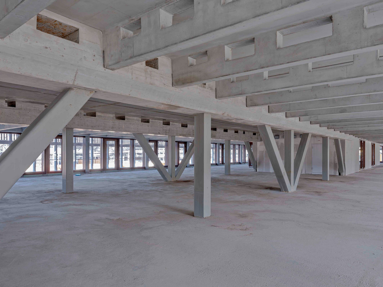 Die Decken über dem Erdgeschoss und dem 5. Obergeschoss wurden als Ortbeton-Flachdecken ausgeführt. Über dem 1. bis 4. Obergeschoss wurden sie in den Randbereichen als 73 cm starke vorgespannte Rippendecken und im Mittelbereich als Ortbetonflachdecken ausgebildet uns durch eine 14 cm starke Überbetonschicht miteinander verbunden. Auf den Stützenachsen sind die Rippendecken jeweils auf die über die gesamte Gebäudelänge durchlaufenden Unterzüge aufgelagert. Die durch die Rippendecken erzielte hohe Steifigkeit führt gleichzeitig zu geringeren Vertikal- und damit Fundationslasten, einem verbesserten Schwingungs- und Erdbebenverhalten sowie einer erhöhten Ressourceneffizienz, die durch die Verwendung von Recyclingbeton für die Überbetonschicht noch gesteigert werden kann. Die Decken über dem Erd- und Dachgeschoss sind als 44 cm bzw. 32 cm starke Flachdecken ausgebildet, um eine höhere Flexibilität der Haustechnik zu ermöglichen. Die Geschossdecken werden mit Verdrängungskörpern (System Cobiax) ausgeführt. Die Betoneinsparung durch die Hohlkörper führt zu geringeren Eigenlasten und damit zu einem besseren Verhalten bei Erschütterungen im Erdbebenfall und zu einer erhöhten Ressourceneffizienz.