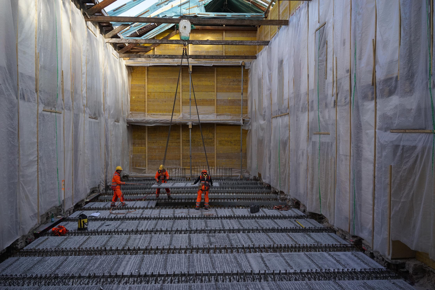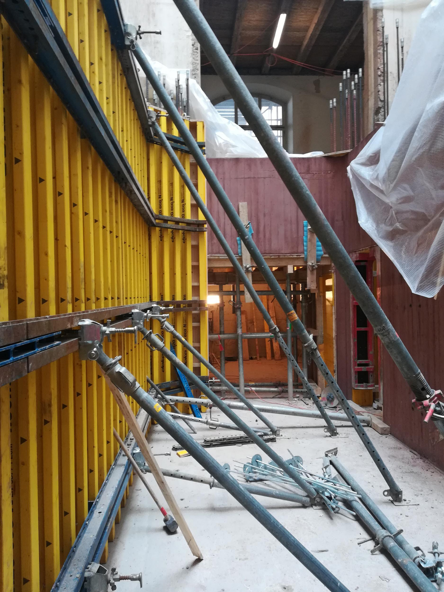 Das neue Gebäude fügt sich in die bestehende Gebäudehülle des Hauptbaus ein. Die grundsätzliche Strukturierung und das Prinzip des vertikalen Lastabtrags bleiben im Wesentlichen bestehen. Die Stockwerkslasten werden auf die beiden Aussenwände in Gebäudelängsrichtung und auf die zentrische Innenwand geleitet. Mit der Umnutzung werden die Decken auf zeitgemässe Ausbau- und Nutzlasten ertüchtigt. Daher werden die Stockwerksdecken als Holz-Beton-Hybriddecken ausgebildet. Die bestehenden Holzbalken werden weiter verwendet, teilweise seitlich aufgedoppelt sowie mit einer dünnen Ortbetonschicht schubsteif ergänzt. Im Versammlungsraum und über der Plaza im zentralen Bestandteil des Gebäudes werden aufgrund von höheren Nutzlasten, einer möglichen Nutzung mit dynamischen Konzertbeanspruchungen und der grösseren Spannweite die Decken als Stahlbetonrippendecken ausgebildet. Die Rippe kommt in Anlehnung an die Holz-Beton-Verbunddecke als vorgespannter Stahlbetonbalken auf die Baustelle und wird mit einer dünnen Ortbetonplatte ergänzt. Aufgrund der grossen Schalhöhen werden verlorene Beton-Schalelemente verwendet.