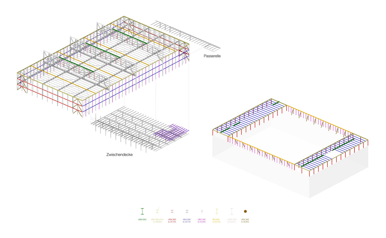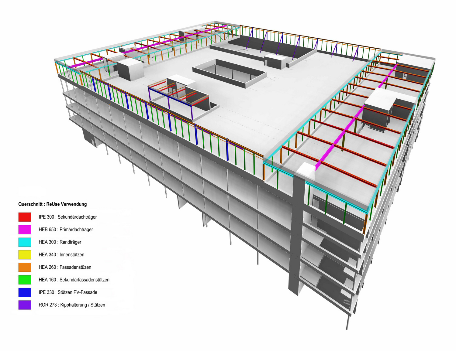 Die hohe Wiederholungsrate bestimmter Profile, insbesondere des gängigen IPE 300 mit rund 60 %, bildete die Grundlage für ein modulares Konstruktionssystem. Dadurch lassen sich Raster und Aufbauhöhen so gestalten, dass auch heutige Anforderungen an Büro-, Gewerbe- oder Wohnnutzungen erfüllt werden können. Diese daraus resultierende Standardisierung vereinfacht Planung und Ausführung, erfordert jedoch eine bewusste ingenieurtechnische Abwägung: Geschweisste Verbindungen sind trotz eingeschränkter Wiederverwendbarkeit statisch effizienter als verschraubte Knoten und bleiben deshalb ein zentrales Element leistungsfähiger Tragwerke. So entsteht aus dem Bestand keine Einschränkung, sondern eine neue Form konstruktiver Flexibilität.