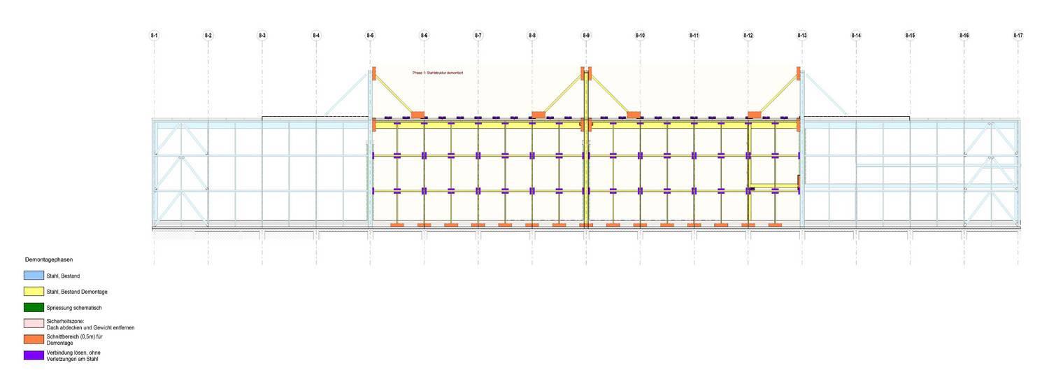 Die Halle mit 70 m Spannweite wurde folglich nicht konventionell rückgebaut, sondern in einem ingenieurtechnisch gesteuerten Prozess etappenweise demontiert. Rund 1300 t Stahlträger wurden geprüft, digital erfasst, mit QR-Codes inventarisiert und für die Wiederverwendung vor Ort bereitgestellt.