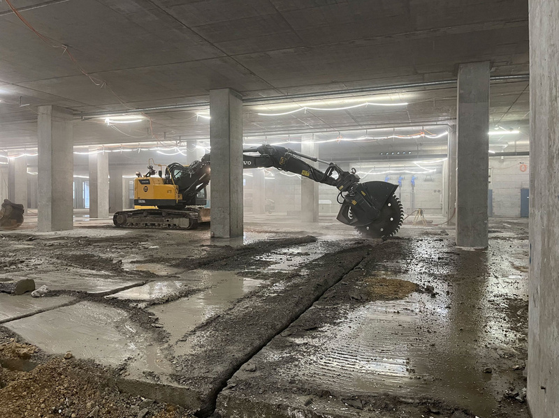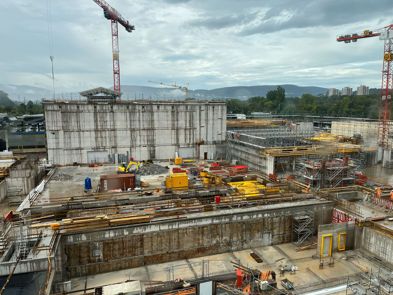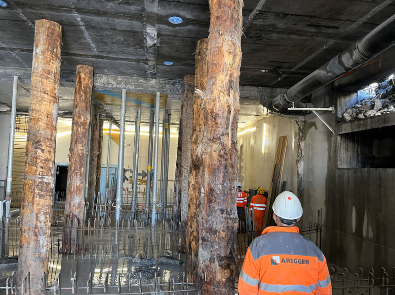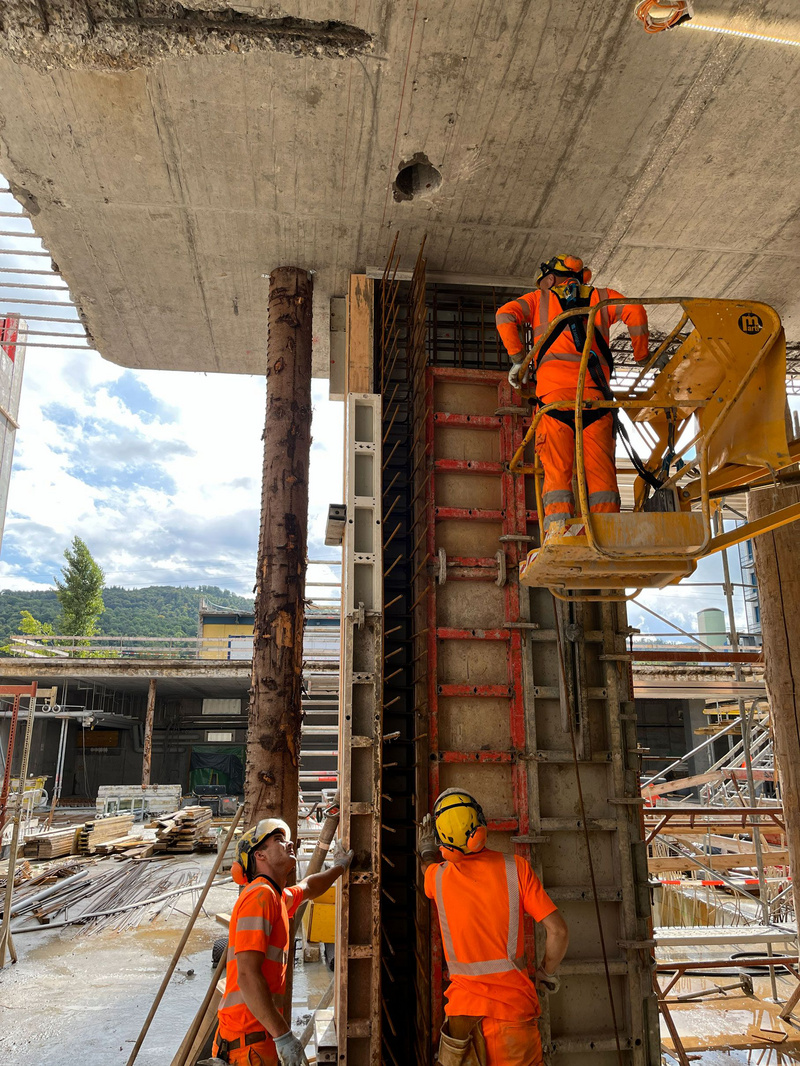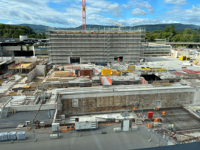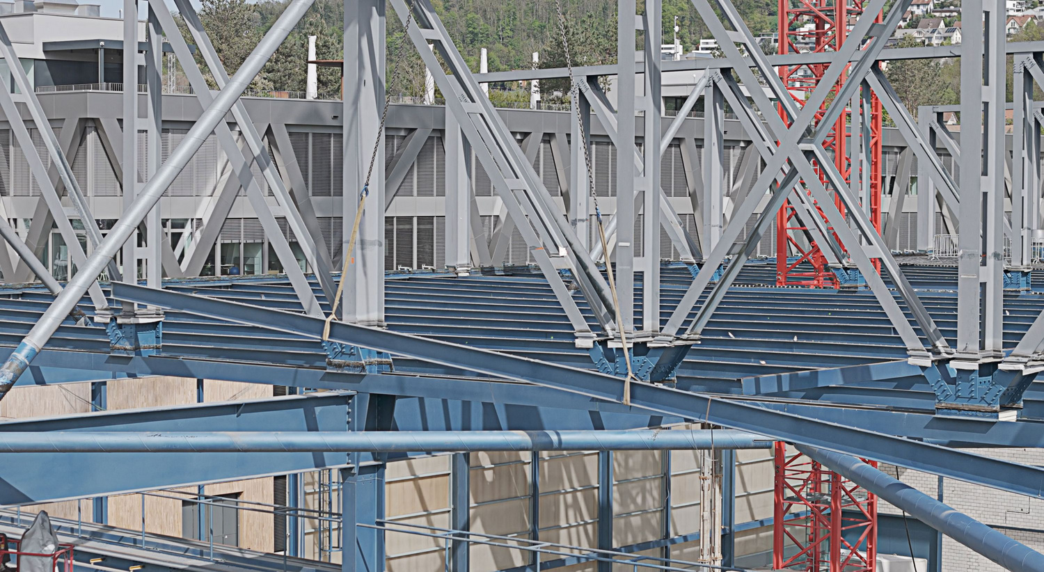 Eine Schlüsselrolle spielte die ehemalige Panzerhalle, die nicht als Abbruchprojekt, sondern als Materiallager verstanden wurde. Ihr Baumaterial befand sich in gutem Zustand. Die Tragkapazität von Gründung und Untergeschoss war so hoch, dass diesem mit lokalen Ertüchtigungsmassnahmen eine zeitgemässe Vollnutzung aufgesetzt werden konnte, ohne das Fundament zu verstärken. Visuellen Inspektionen zeigten nur geringe Korrosion, Festigkeitsprüfungen bestätigten die Materialqualität, und Schraub- und Schweissverbindungen waren überwiegend intakt. Das Dach aber erwies sich mit zulässigen Nutzlasten unter 100 kg/m als statisch unzureichend. Diese Diskrepanz zwischen konstruktiver Qualität und gegenwärtiger Nutzungsanforderung führte zur Projektidee: Anstelle eines Weiterbaus entstand ein neuer, viergeschossiger Stahlbetonbau auf dem bestehenden Untergeschoss, ergänzt durch zwei Technikpavillons.