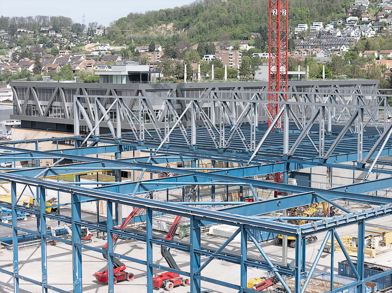 Der Bestandsbau (links) und die Wiederverwendung von Stahl im Neubau Gebäude 8, oberstes Geschoss (rechts)