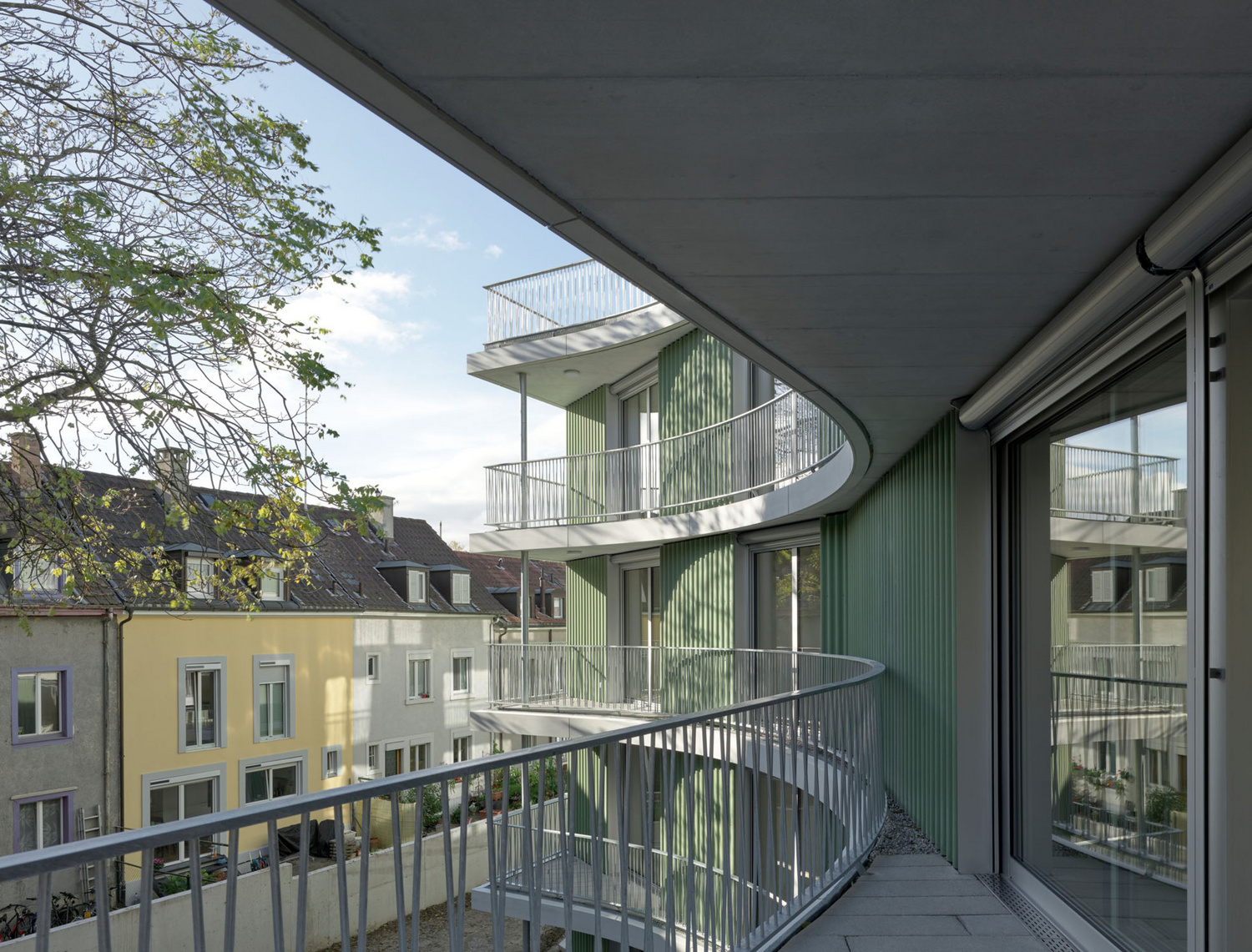 An bevorzugter urbaner Wohnlage wurde ein Hofhaus in der Stadt realisiert. Der Neubau ersetzt Gewerbebauten in einem zur Hegenheimerstrasse geöffneten Hof. Form und Materialisierung orientieren sich am Charakter der Nutzbauten, die sich traditionellerweise in den Höfen des Quartiers befinden. Das viergeschossige Gebäude mit 21 Wohnungen verfügt über ein zurückversetztes Attikageschoss und ein Untergeschoss mit Einstellhalle. Ein Grossteil der 2.5- und 3.5-Zimmerwohnungen hat einen privaten Aussenraum: im Erdgeschoss in Form von Gärten, in den Wohnungen darüber als Balkone oder Loggien sowie im obersten Stockwerk als Dachterrassen. Der unregelmässige Grundriss entsteht durch eine optimale Ausnutzung der Parzelle.