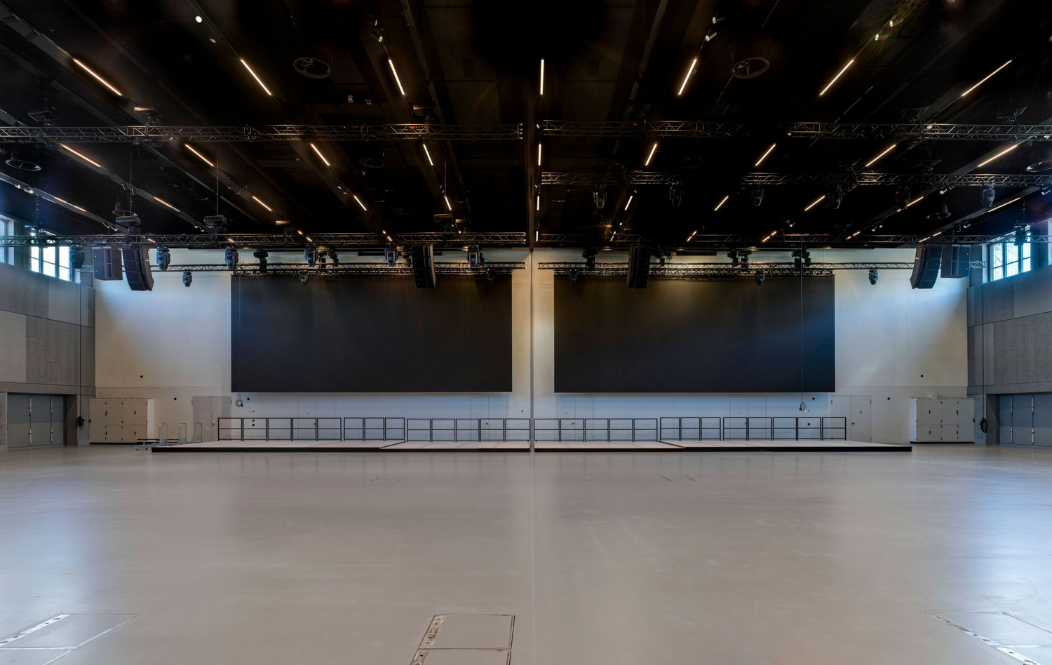 Der Neubau umfasst zwei Hauptbereiche: die 47 x 42 Meter grosse Eventhalle und die 82 x 58 Meter messende Multifunktionshalle. Beide Bereiche sind durch das zentrale Foyer statisch, physikalisch und akustisch getrennt und gleichzeitig durch ein filigranes Vordach räumlich eingefasst. Das Untergeschoss verbindet die drei Nutzungsbereiche und das angrenzende Parkhaus, um eine optimale betriebliche Funktionalität zu gewährleisten.