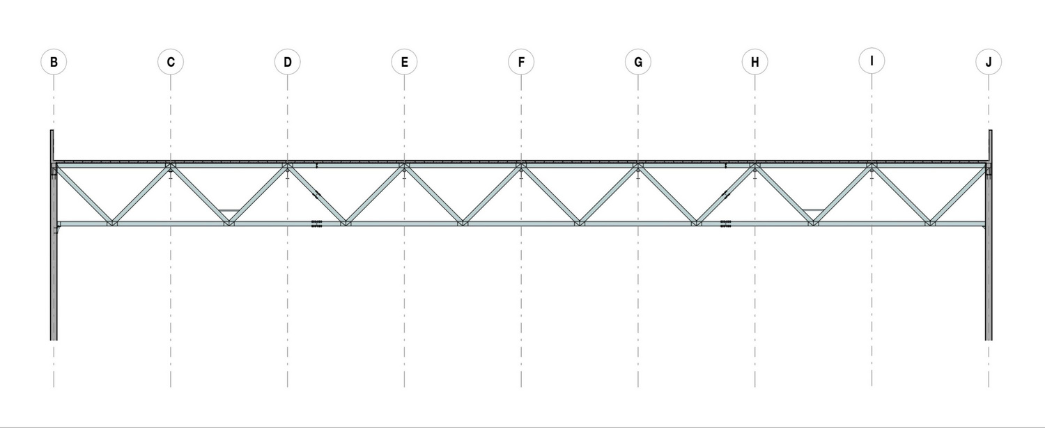 In der Multifunktionshalle kommen 21 Fachwerke mit einer Höhe von rund 4 Meter im Abstand von 3.75 Meter zum Einsatz, die über die kurze Tragrichtung spannen. Eine 15 cm dicke Stahlbetondecke wirkt im Verbund mit den Obergurten und trägt zum Schallschutz bei.