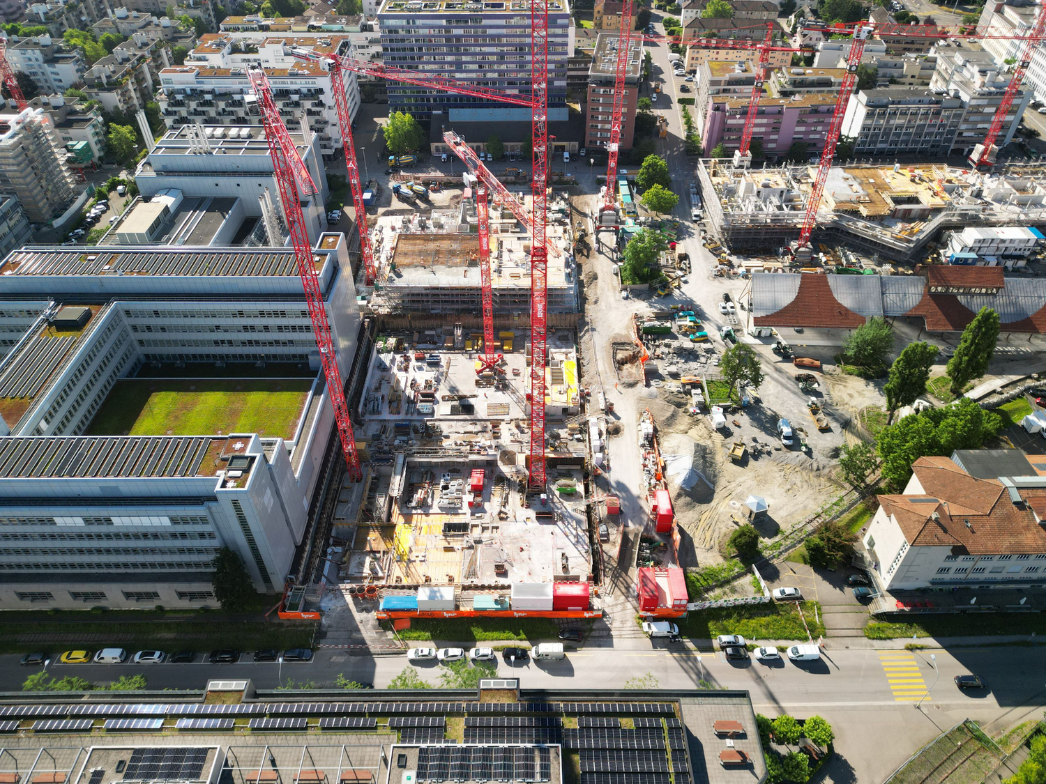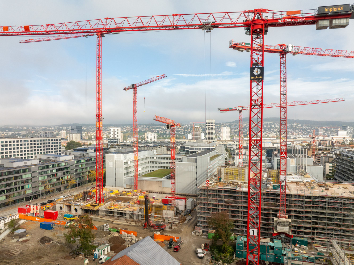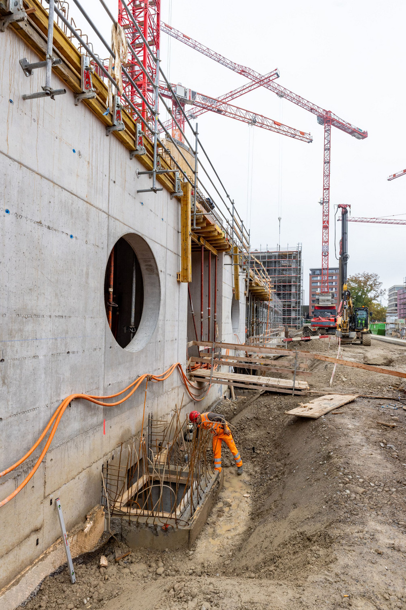 Die Konstruktion folgt einem durchdachten Skelettbausystem mit vorfabrizierten Betonstützen und Ortbetonflachdecken. Besonders innovativ ist die Nutzung aller Wohnungstrennwände als tragende Betonelemente – eine Lösung, die sowohl Schallschutzanforderungen erfüllt als auch wesentlich zur horizontalen Aussteifung gegen Wind- und Erdbebenlasten beiträgt. Ergänzend stabilisieren betonierte Stirnfassaden und zentrale Erschliessungskerne das Hochhaus. Ortbetonbrüstungen entlang der Deckenränder bieten zusätzlichen Brandschutz. Die enormen Lasten des Hochhauses werden über grosskalibrige Ortbetonbohrpfähle mit 120 Zentimetern Durchmesser und 25 Metern Länge in den Baugrund abgetragen. Der begleitende Zeilenbau (16 x 48 Meter, 25 Meter hoch) als konventioneller Massivbau erhält eine Kombination aus kleineren Bohrpfählen und Flachgründung. Eine 1,5 Meter grosse Auskragung über dem ersten Obergeschoss wird durch gebäudehohe Tragscheiben ermöglicht.