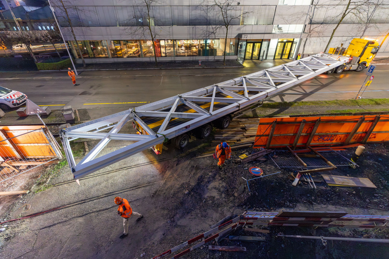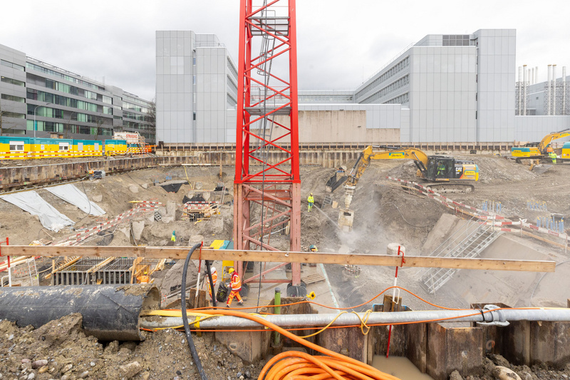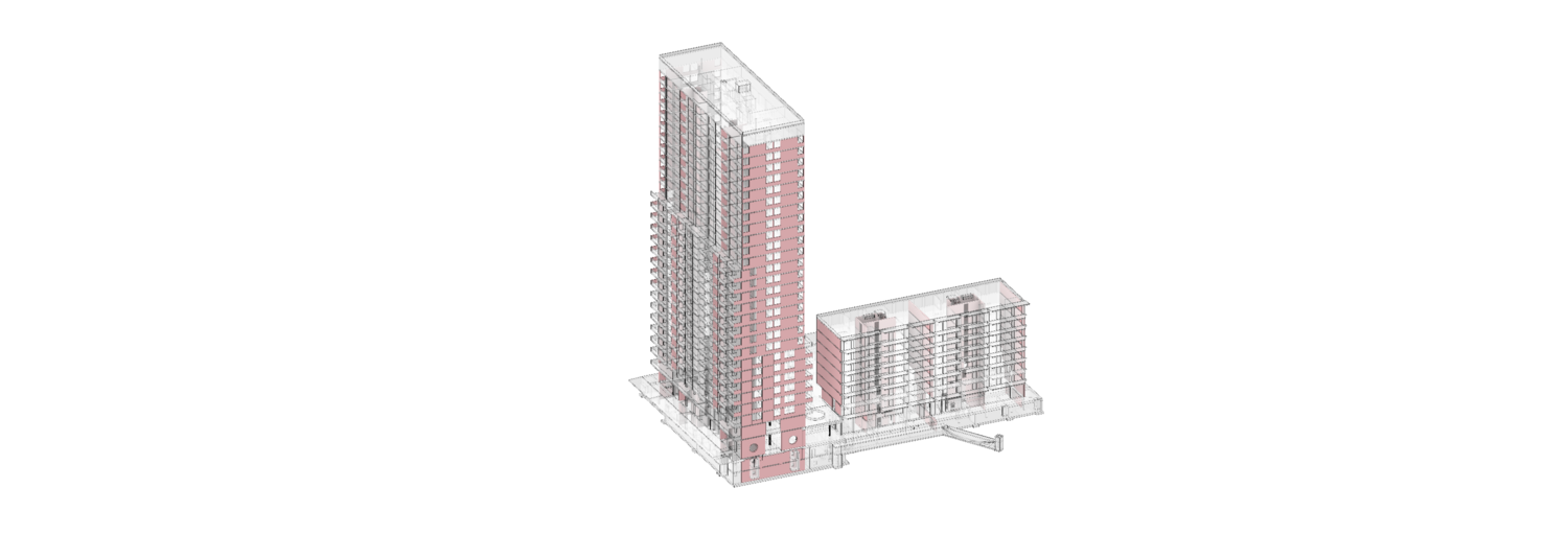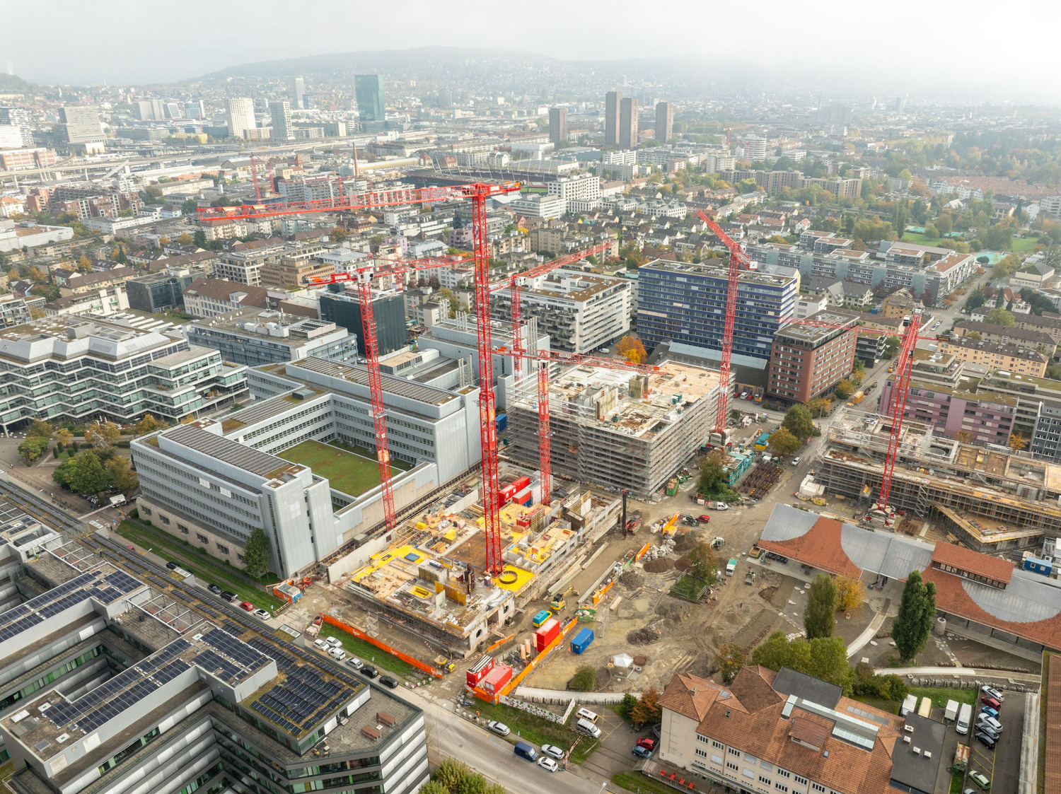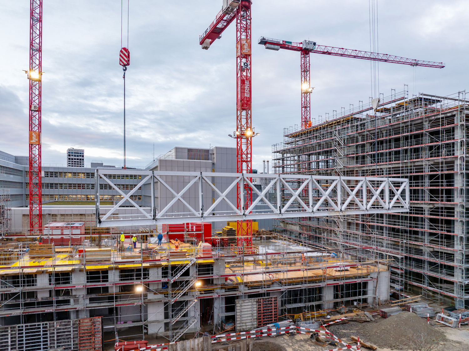Die Konstruktion folgt einem durchdachten Skelettbausystem mit vorfabrizierten Betonstützen und Ortbetonflachdecken. Besonders innovativ ist die Nutzung aller Wohnungstrennwände als tragende Betonelemente – eine Lösung, die sowohl Schallschutzanforderungen erfüllt als auch wesentlich zur horizontalen Aussteifung gegen Wind- und Erdbebenlasten beiträgt. Ergänzend stabilisieren betonierte Stirnfassaden und zentrale Erschliessungskerne das Hochhaus. Ortbetonbrüstungen entlang der Deckenränder bieten zusätzlichen Brandschutz. Die enormen Lasten des Hochhauses werden über grosskalibrige Ortbetonbohrpfähle mit 120 Zentimetern Durchmesser und 25 Metern Länge in den Baugrund abgetragen. Der begleitende Zeilenbau (16 x 48 Meter, 25 Meter hoch) als konventioneller Massivbau erhält eine Kombination aus kleineren Bohrpfählen und Flachgründung. Eine 1,5 Meter grosse Auskragung über dem ersten Obergeschoss wird durch gebäudehohe Tragscheiben ermöglicht.