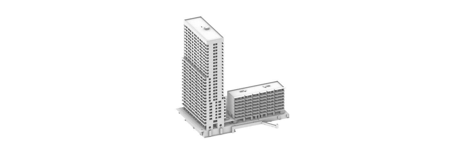 Der zweigeschossige Sockelbau mit einem Lebensmittelgeschäft und einer Tiefgarage verbindet beide Gebäude. Sein begrünter Dachgarten wird durch einen 3,40 Meter hohen Stahl-Fachwerkträger über der Anlieferzone ausgekragt. Die Untergeschosse werden als wasserdichte "weisse Wanne" ausgeführt. Einzelne Bereiche werden zusätzlich mit einer „gelben Wanne” abgedichtet und die Baugrube durch abgestützte Spundwände gesichert.