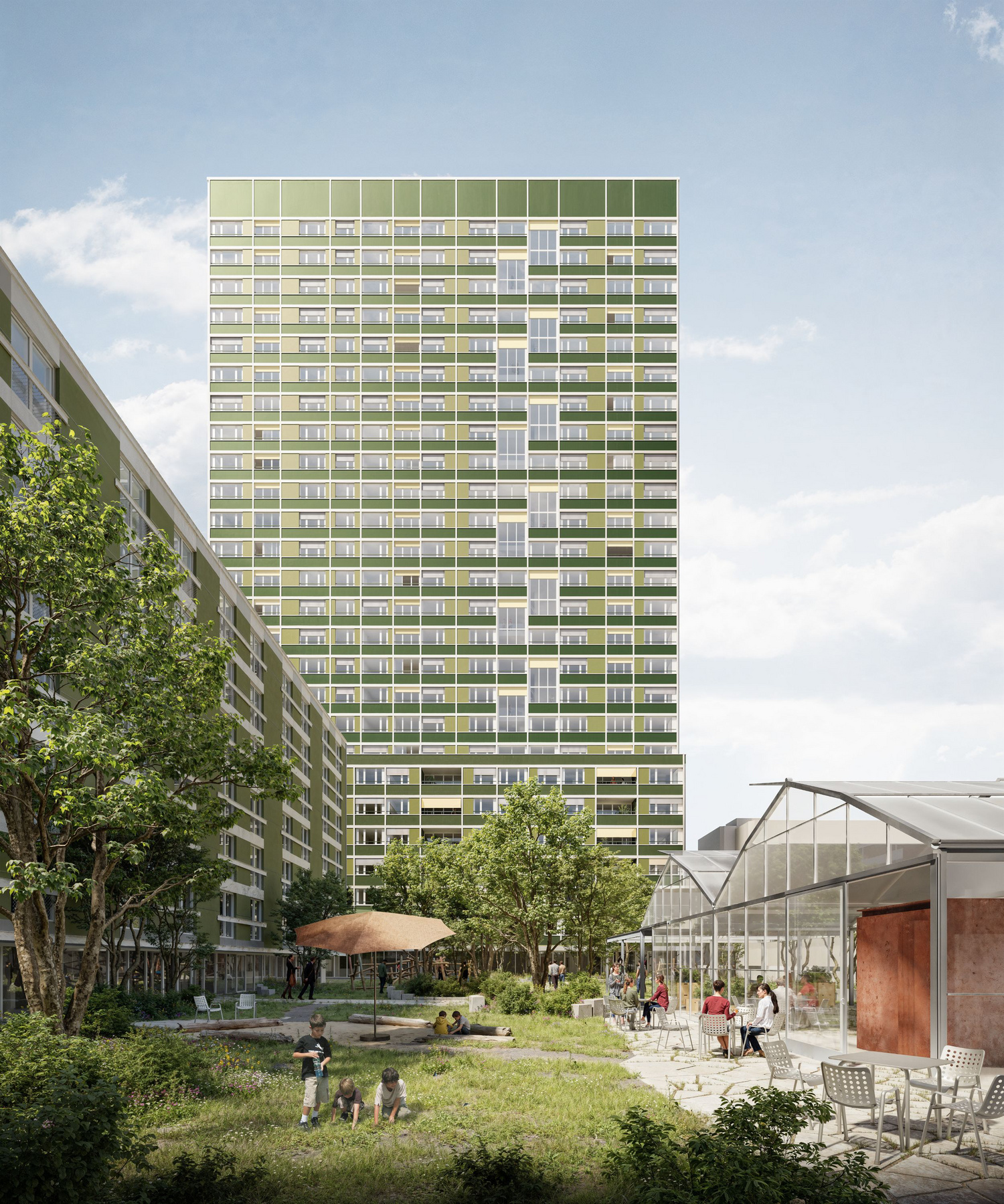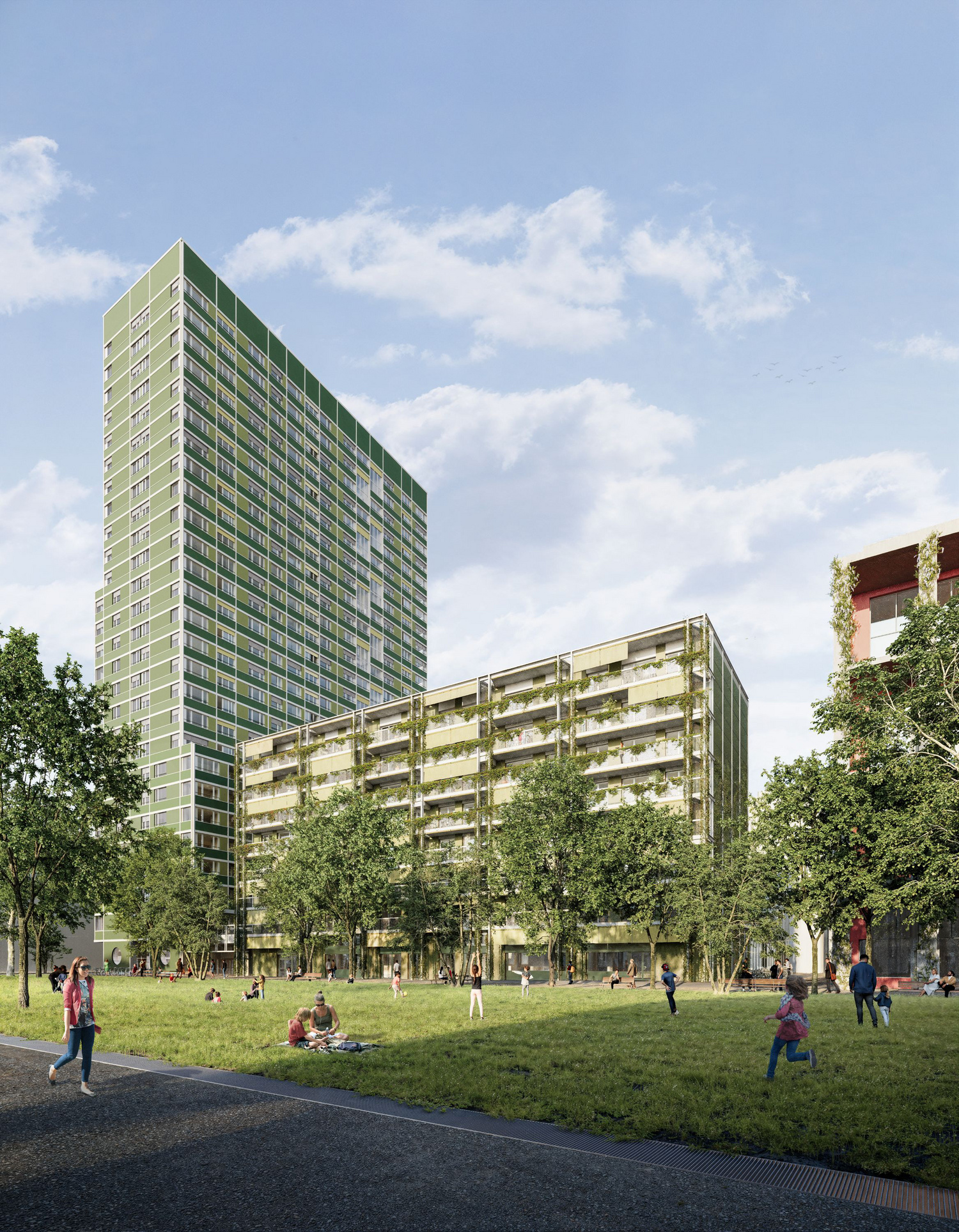 Auf dem Baufeld B errichtet die ABZ ein 85 Meter hohes Hochhaus mit rund 200 Wohnungen. Das Gebäude mit einem Grundriss von 21 x 47 Metern umfasst 26 Obergeschosse und weist zwei markante Verjüngungen auf: Im achten Obergeschoss reduziert sich die Breite auf 19 Meter und im 16. Geschoss auf 17 Meter. Diese Gestaltung schafft eine elegante Silhouette und optimiert die statischen Verhältnisse. Neben dem Hochhaus ist ein Zeilenbau mit Wohnungen sowie ein Sockel mit einem Detailhändler und einem Dachgarten vorgesehen. Zudem soll auf der Dachgartenebene ein Pavillon als Gemeinschaftsraums mit Re-Use-Bauelementen eines Gewächshauses neu errichtet werden. Angrenzend ist eine Pergola als Anbau vorgesehen.