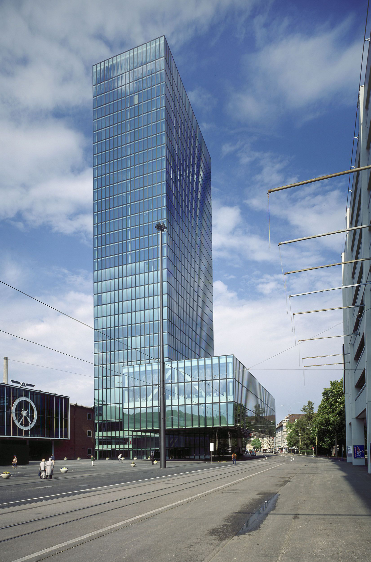 Modeled on Lever House in New York City, the 105-meter-high glass shaft of the Messeturm dominates Basel’s cityscape. The starting point for the tower was the strategy set forth in the “Messe Basel Plus” project that was adopted in 1994, which foresaw keeping the trade fair in the city and expanding its traditional location. The city of Basel, together with the Swiss trade fair organizer MCH Group, held an international, two-stage architectural competition, which resulted in the selection of the design by the planning team Morger & Degelo / Marques Architects, in cooperation with Schnetzer Puskas Ingenieure.