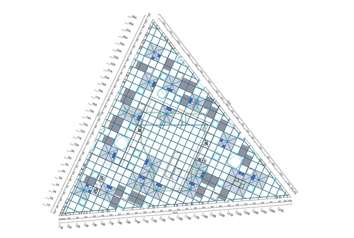 The shape and orientation of the roof of the Forum 2004 in Barcelona are based on urban axes: The architectural and urban relationships yield a nearly equilateral triangular roof with sides that are each roughly one hundred eighty meters long. The sheer size is hard to comprehend: The roof is supported on just seventeen points and has spans of sixty meters. The corners of the triangular roof cantilever out as much as twenty-five meters. The exhibition level is suspended from the roof structure, which covers the conference center and the plaza, which is grouped around the forum. The steel and concrete composite construction has a static height of four meters and resembles a sandwich: Between the thirty-centimeter-thick upper and lower concrete slabs, which function as compression and tension zones, are steel trusses that are substantially responsible for the shear connection between the two slabs.