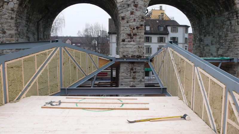 The load-bearing structure of the standardized arch units is a mixed construction of timber, steel and concrete. A timber-only design would have required hefty trussing as well as joists for the arch units whereas the carefully judged combination of wood and steel finally chosen produces relatively small ceiling depths with no visible joists. Together, the facade fronts, gallery and new roof construction beneath the arches form a connected framework of steel girders and columns that are in-filled with shear-resistant paneled beams and wooden elements or with brickwork. The design of the folded market hall roof is based on the same principle though the main girders inside the timber construction form a steel lattice to deal with the considerable span widths of up to 22 meters.