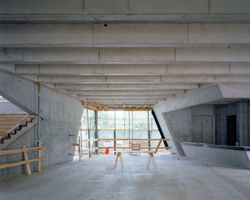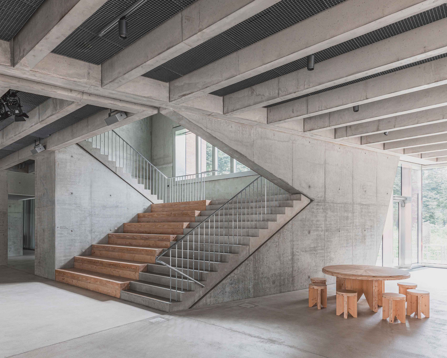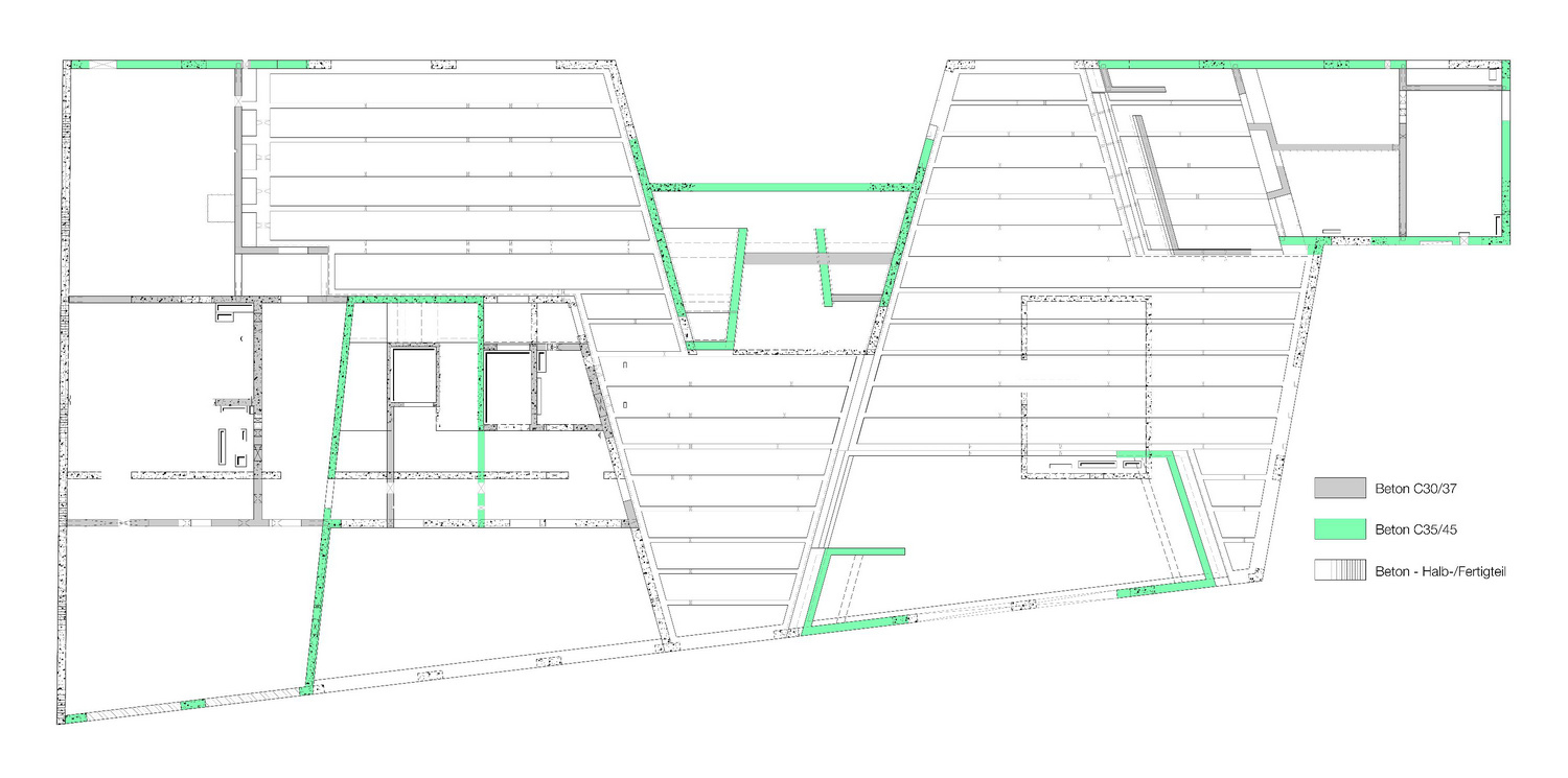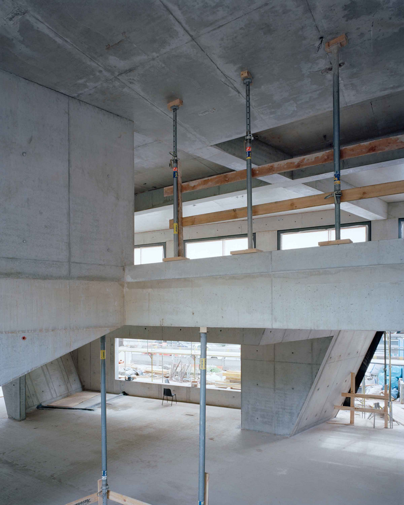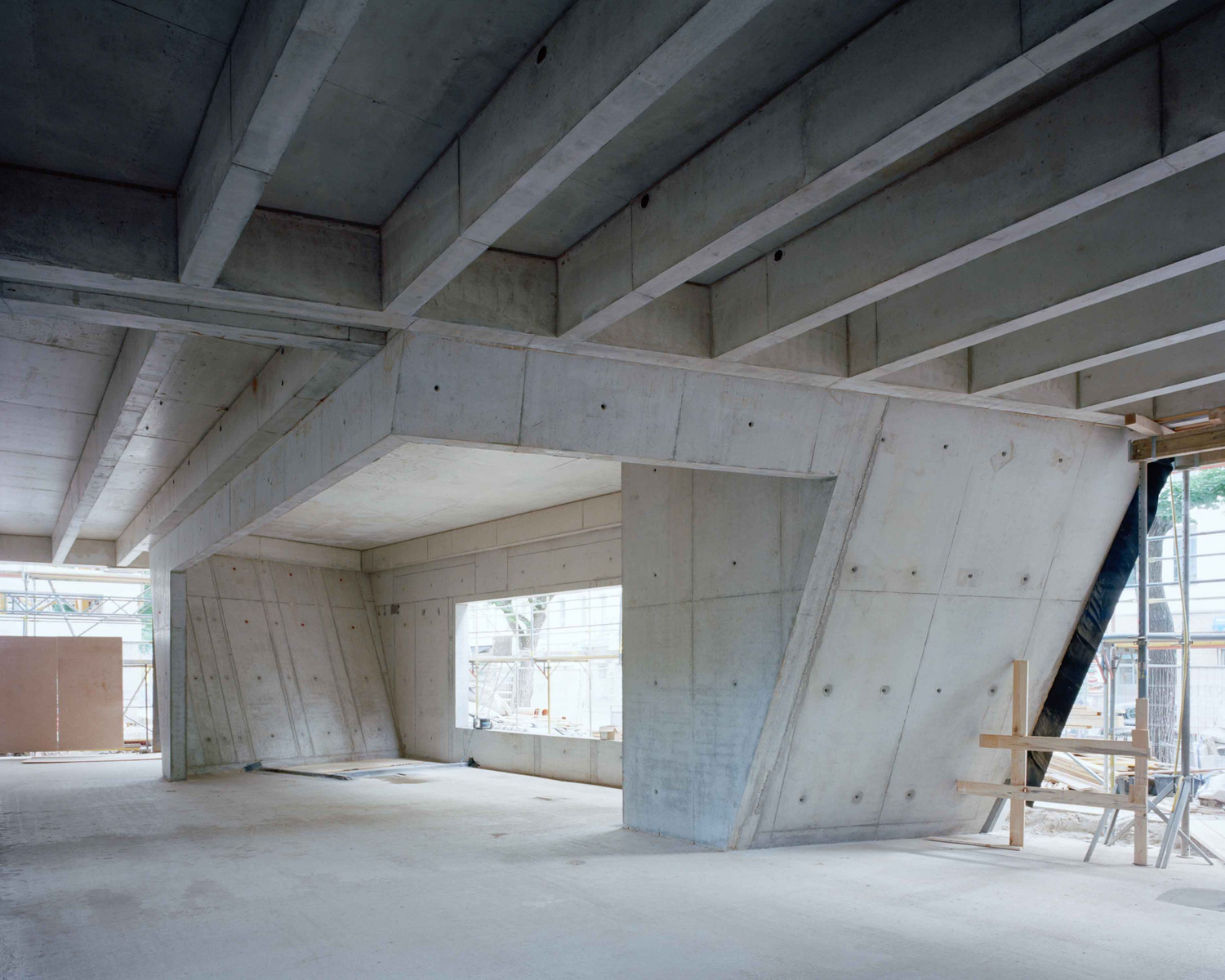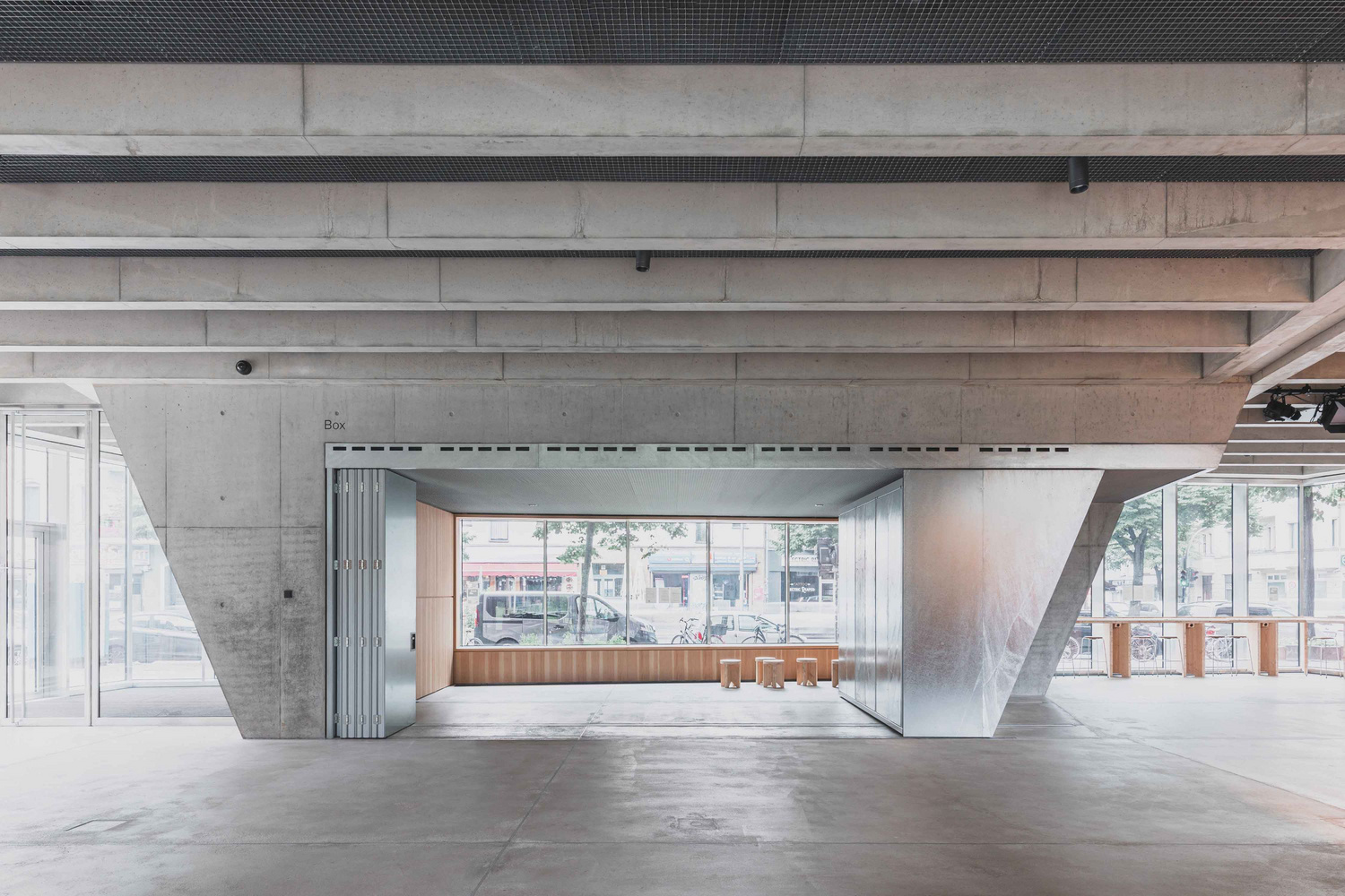 The innovative load-bearing structure of the Spore building is particularly worthy of note. The exposed ‘Spore ceiling’, developed using 3D parametric simulations, translates principal stress trajectories into a material-optimized concrete rib configuration that allows column-free span widths of up to 12 meters. As well as creating column-free museum and first-floor space, this ingenious load-bearing system, which comprises slabs that evoke organic forms and pre-stressed wall panels extending over three floors, also solves the complex problem of laying foundations above the subway tunnel that runs beneath the street.
