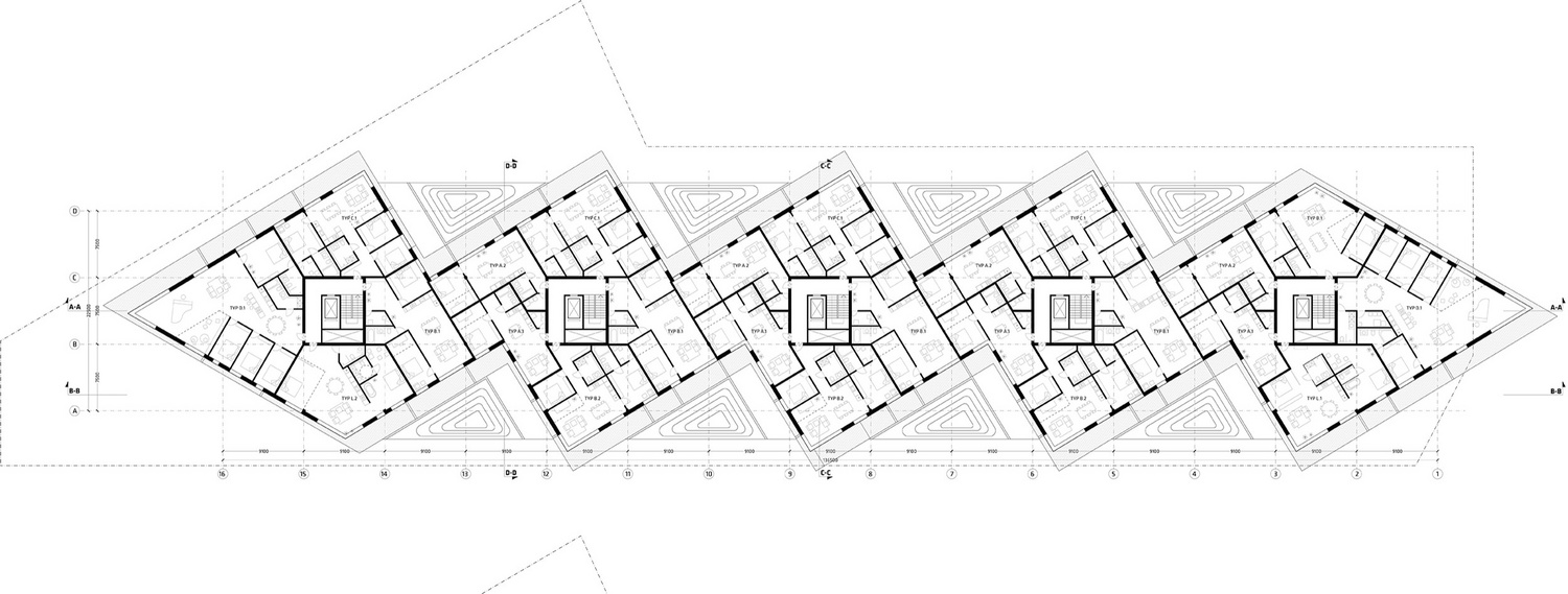 The floor plan of the existing building had the form of a very long rectangle with trapezoidal fringes. The new floor plan area of the additional stories was divided into five large surfaces, which in turn were each twisted by 45 degrees to the initial position. This measure meant that a multilateral illumination for all apartments could be created. The two surfaces at the head ends of the building were extended outwards, so that projections of up to 11 m resulted. The support grid of the existing building was adopted for the additional stories. To a large extent, the support structure was designed as a solid construction. Five cores made of cast-in-place concrete, prefabricated reinforced concrete supports and reinforced concrete flat ceilings constitute the main load-bearing element. The surrounding balconies were of light construction (clad steel construction) and to a large extent prefabricated.