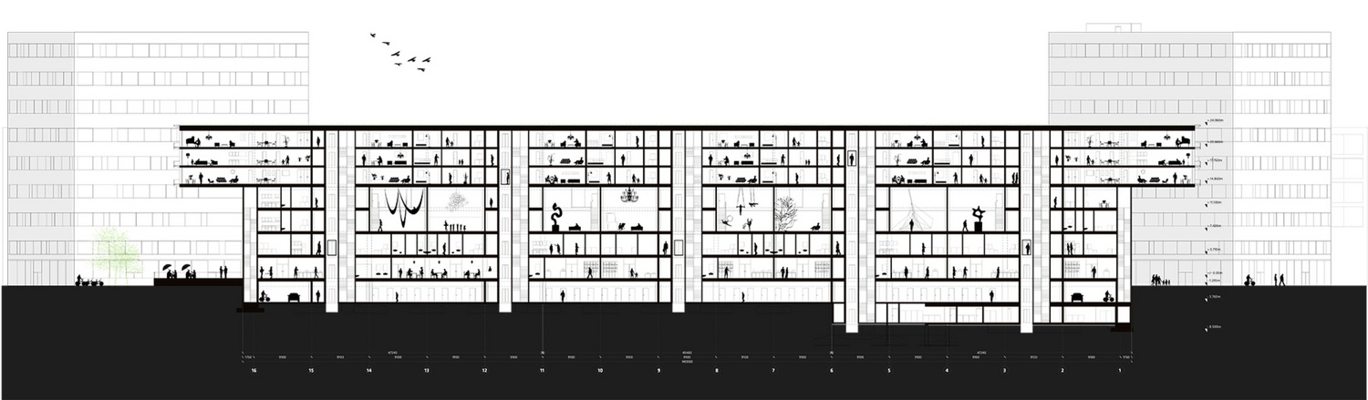 The Dreispitz area encompasses around 50 hectares and forms the hinge between the town of Basel and Münchenstein. The former area of commercial enterprises and warehouses today unites businesses, services and retailers, culture, leisure and living. The former warehouse building from the 1960s was converted by Bjarke Ingels Group (BIG) with the Harry Gugger Studio and extended with a zigzag protruding three-storey addition.