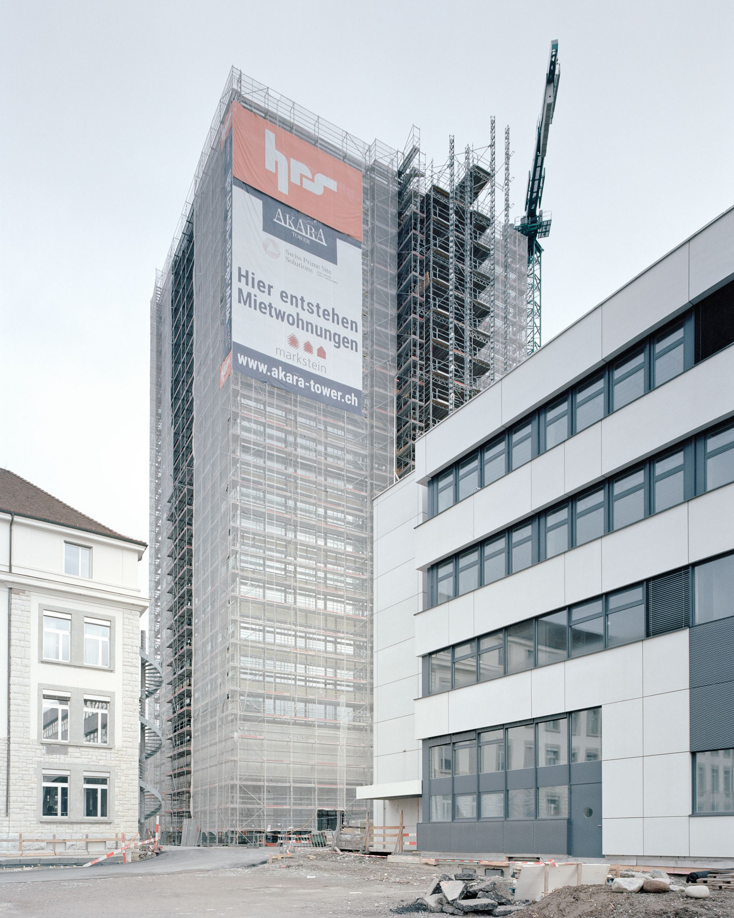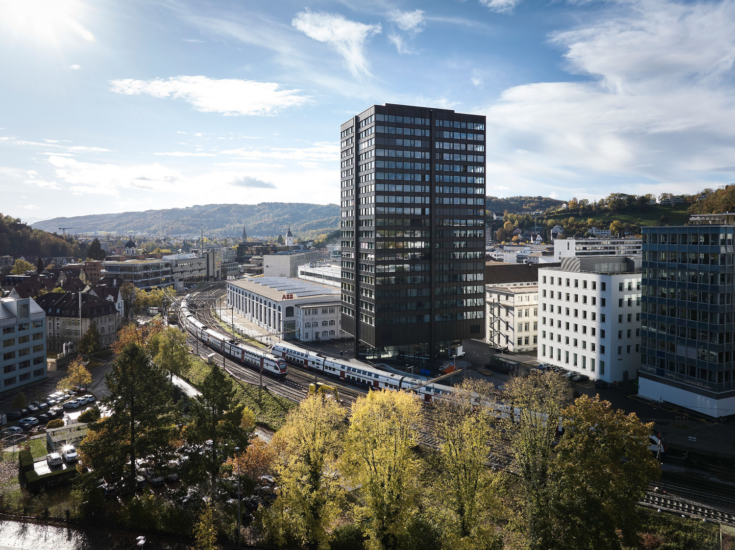 The Baden Ost Tower stands in the center of Baden between an ABB service facility and the new Brown-Boveri-Platz. Rising 68 meters, it is the tallest building in this historical town on the River Limmat. Originally planned as a single-use office high-rise, changes in the property market prompted the decision to switch to a predominantly residential hybrid structure. Now just three of its nineteen upper stories house offices, while a further two floors offer flexible live/work space.