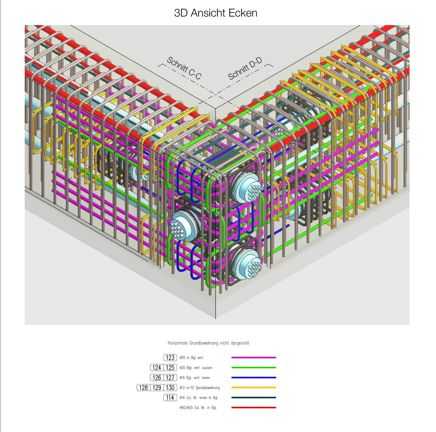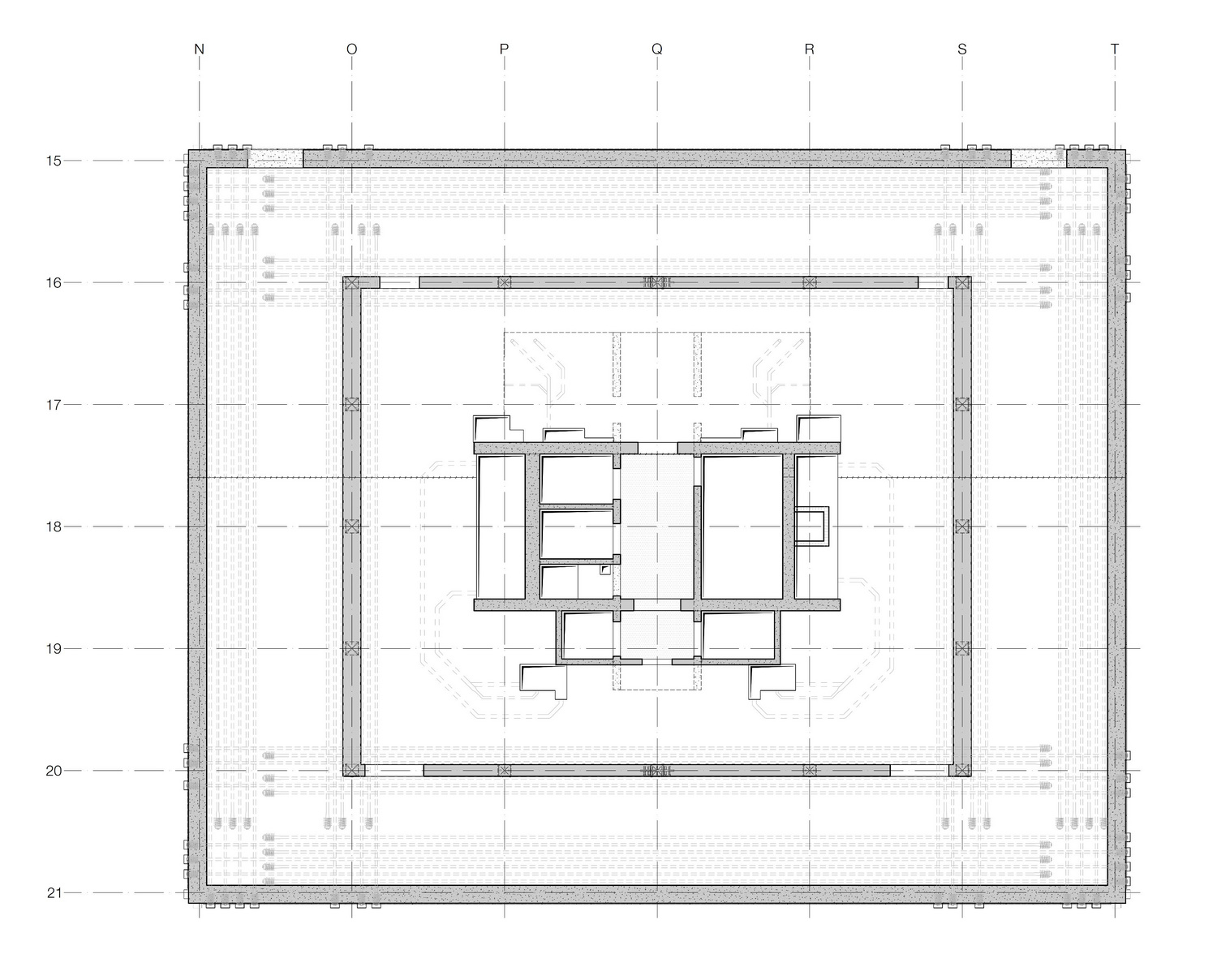 The upper stories are designed as a skeleton framework of flat slabs, central reinforcing circulation core and prefabricated concrete columns. The slab support provided by the facade columns and core is supplemented by a second, inner ring of columns. Due to the constrained nature of the site and the presence of underground structures that could not be built over, the building corners are set back at ground-floor level. This was achieved by designing the first floor as a transfer structure that transmits the column loads of the inner and outer rings down to a small number of main columns on the ground floor. These main columns run down to the base slab, where the loading is transferred to the subsurface via in-situ-cast bored piles. The access core is both clamped into the basement framework and consolidated with bored piles. The core is also stabilized by the transfer floor, which acts as an outrigger. The set-back ground-floor facade creates a star-shaped footprint and canopy-like covered areas with separate entrances for residential and office use.