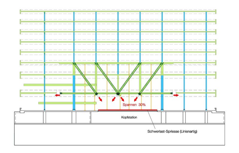 Building 11 was designed as a reinforced-steel skeleton structure with reinforcing cores. Above the ground floor, vertical loads are transferred directly down to the foundations via the cores, the facade supports and a double row of supports within the building. The only exception is the area of the ‘Roche Club’ situated above thew ground floor, where the facade support loads are transferred via a prestressed edge beam to two prestressed main beams that ultimately discharge the loads into four columns inside the building. Lateral stabilization is provided by the access cores inside the building, which are tied into the basement frame.