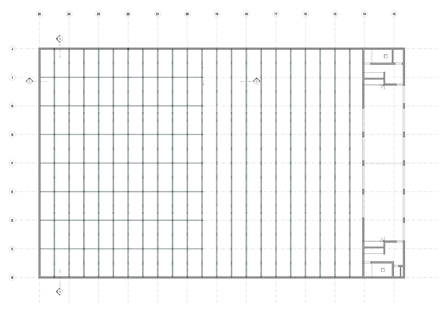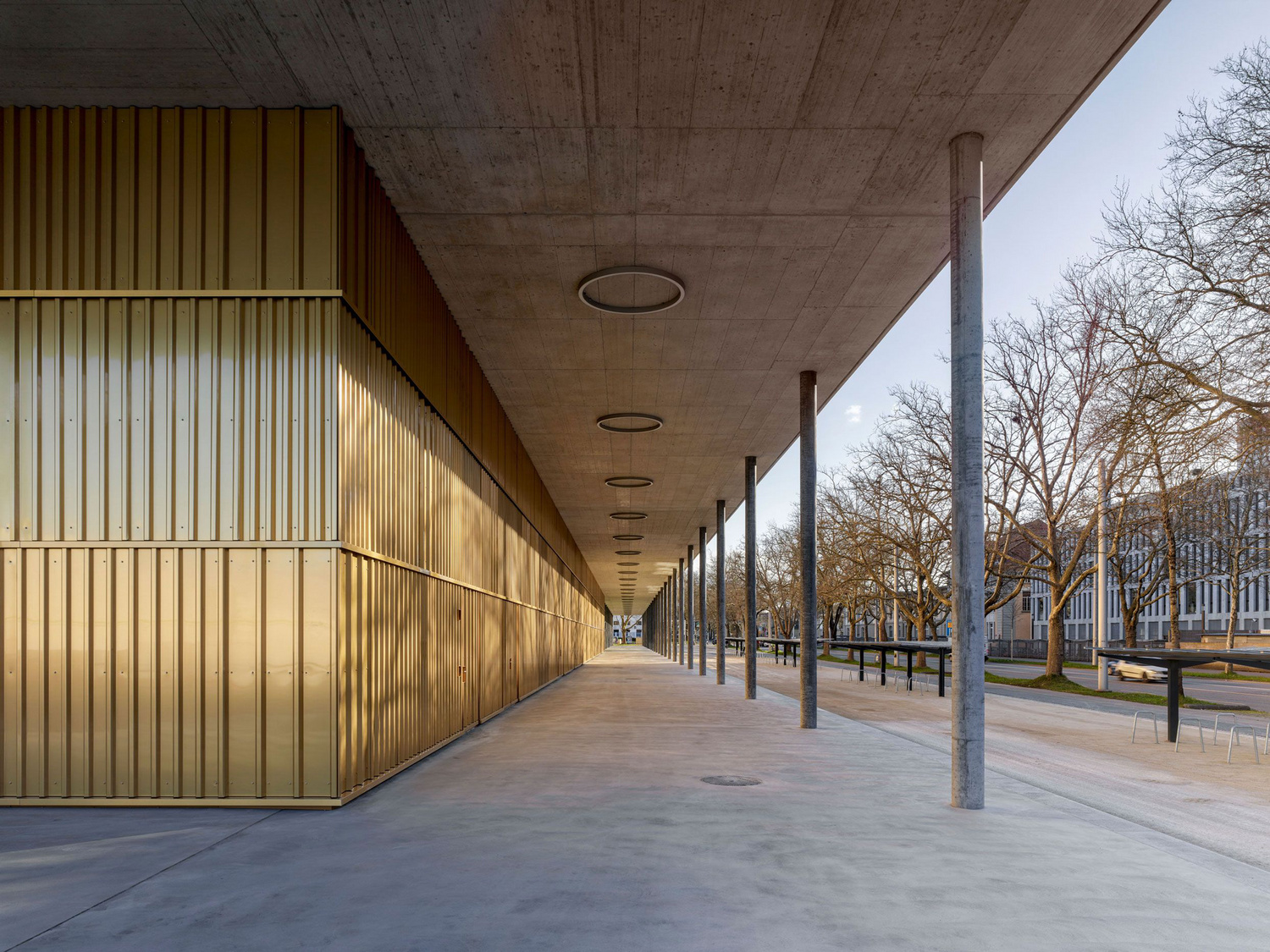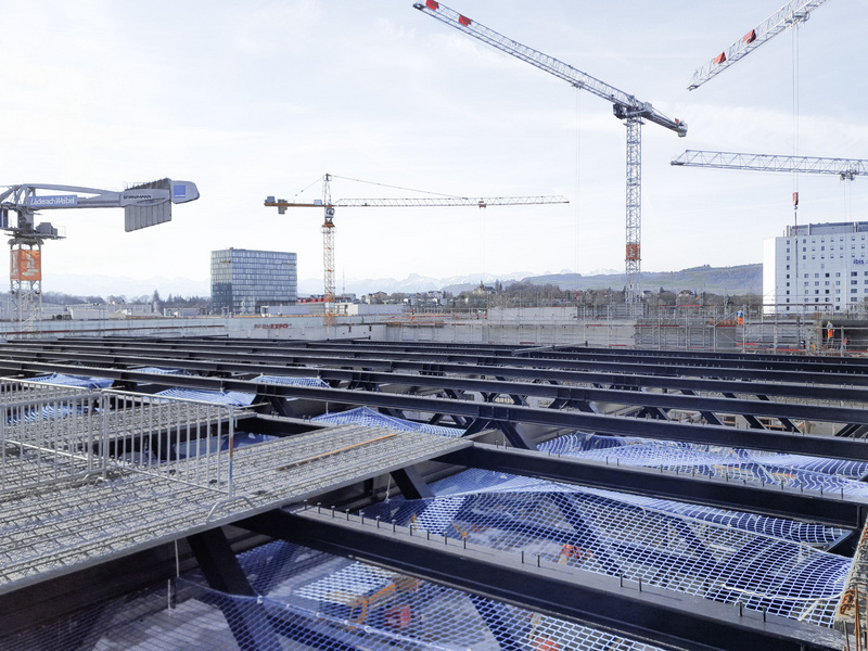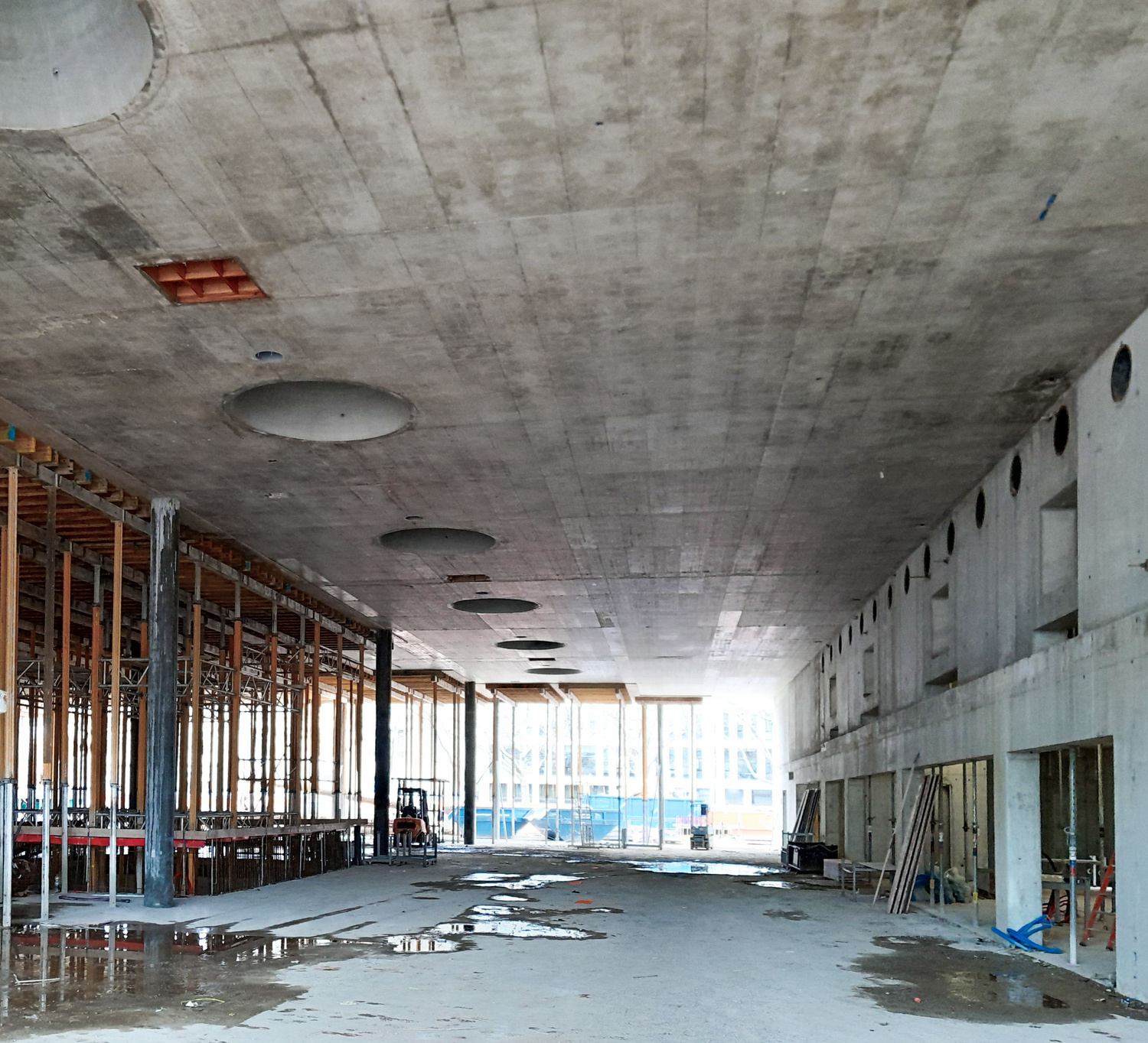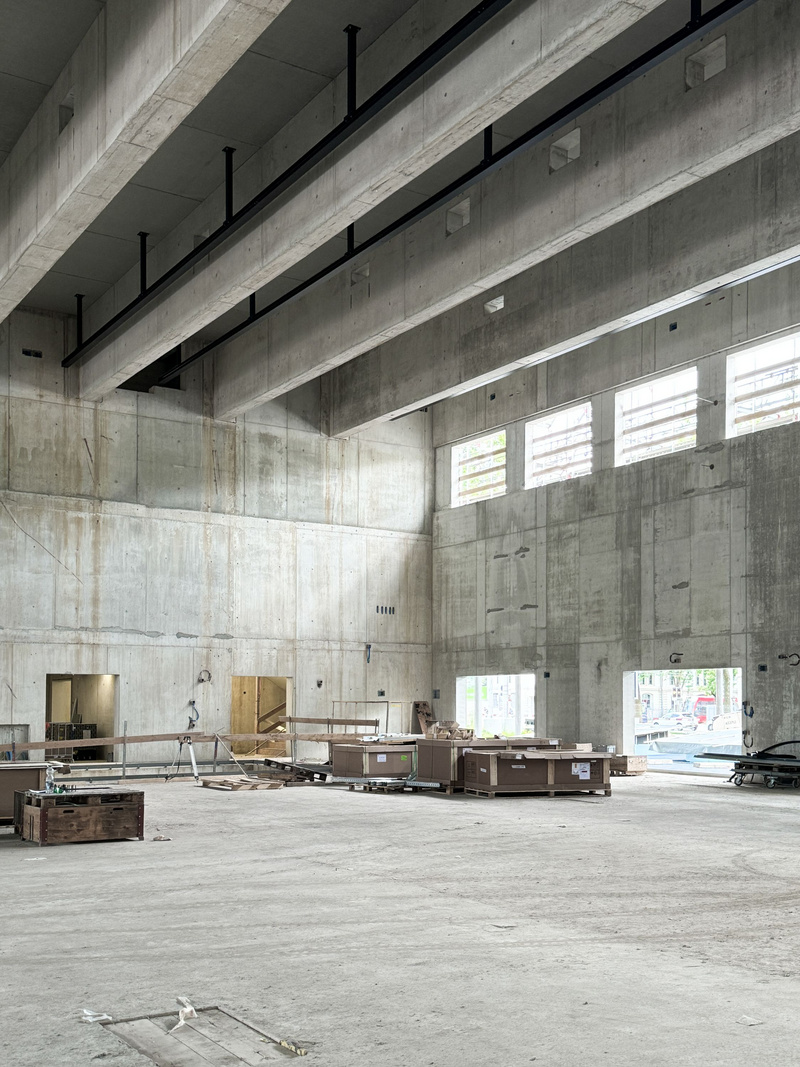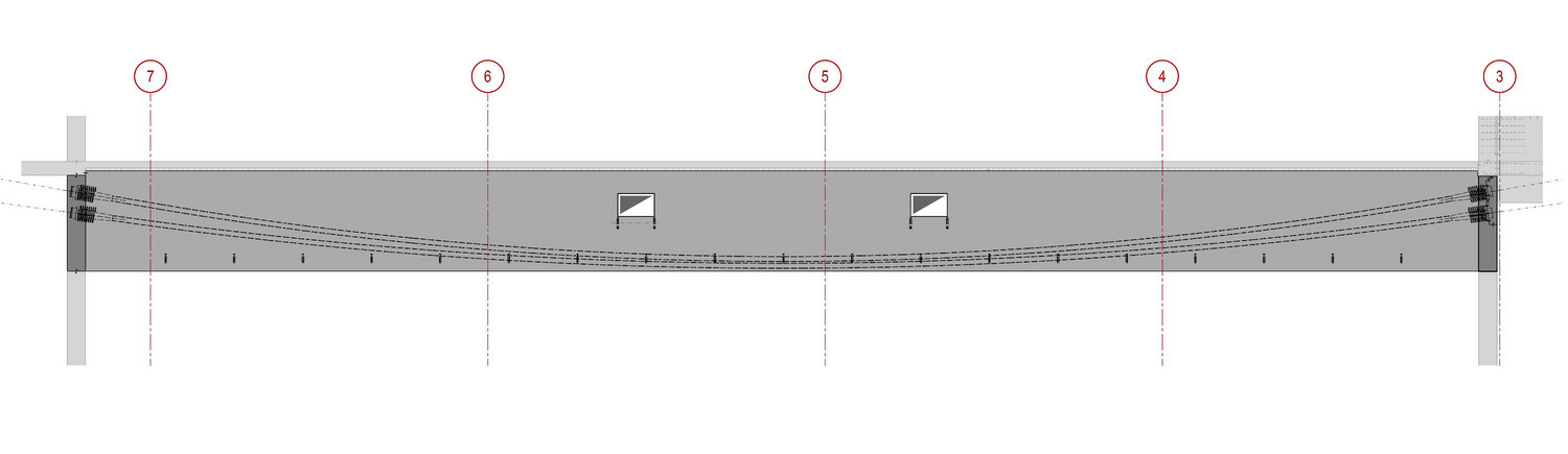A pretensioned 20cm-thick ribbed slab made of 6cm-thick prefabricated reinforced concrete plates overlaid with 14 centimeters of cast concrete spans the larger hall on the ground floor. The 2.2m-high ribs bridge a distance of 31 meters between 40cm-thick reinforced concrete walls. Horizontal bracing is provided by four circulation cores located at the building corners and the in-situ cast concrete walls that enclose the space.