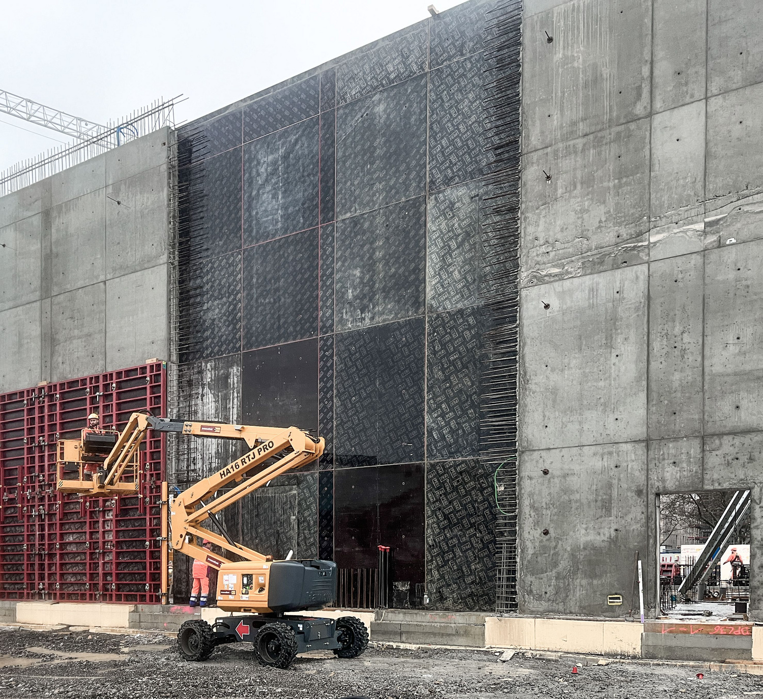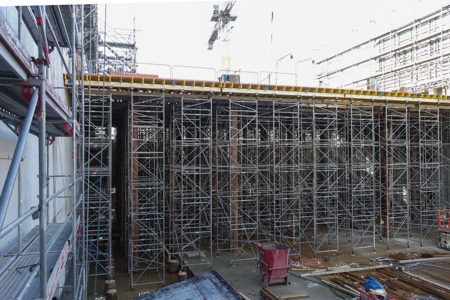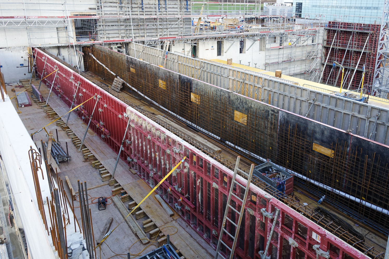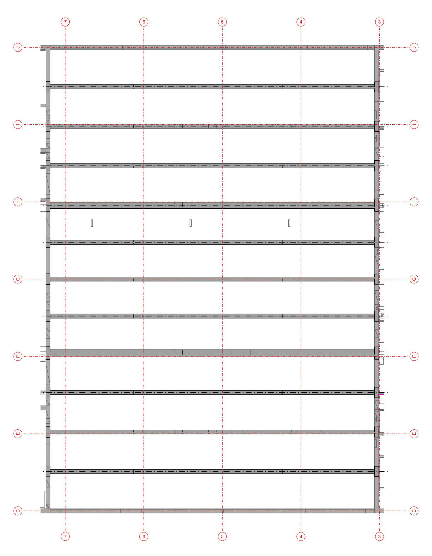A pretensioned 20cm-thick ribbed slab made of 6cm-thick prefabricated reinforced concrete plates overlaid with 14 centimeters of cast concrete spans the larger hall on the ground floor. The 2.2m-high ribs bridge a distance of 31 meters between 40cm-thick reinforced concrete walls. Horizontal bracing is provided by four circulation cores located at the building corners and the in-situ cast concrete walls that enclose the space.