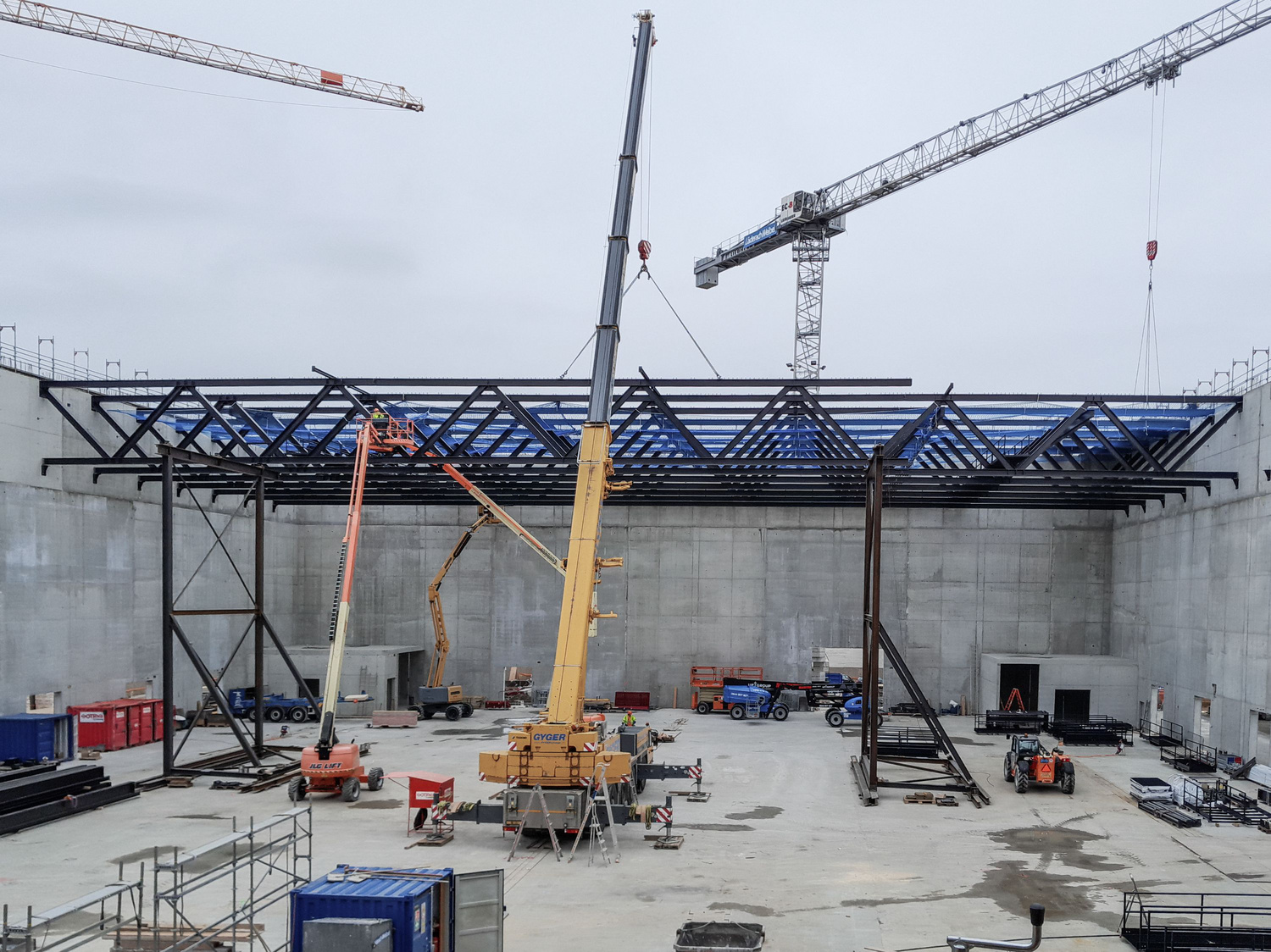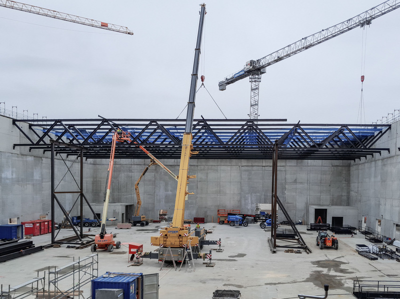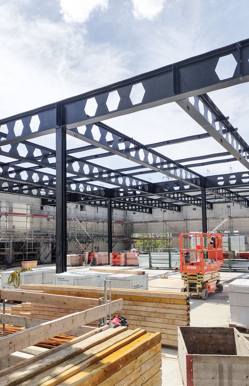 The load-bearing structure is a hybrid steel and concrete construction. The upper floor of the events space has a light steel framework of panels and beams with a structural height of 0.95 meters, while two K-trusses and the roof plate provide horizontal bracing. Roof loads are transferred down to a grid of steel columns via the main beams and longitudinally to the reinforced concrete cores.