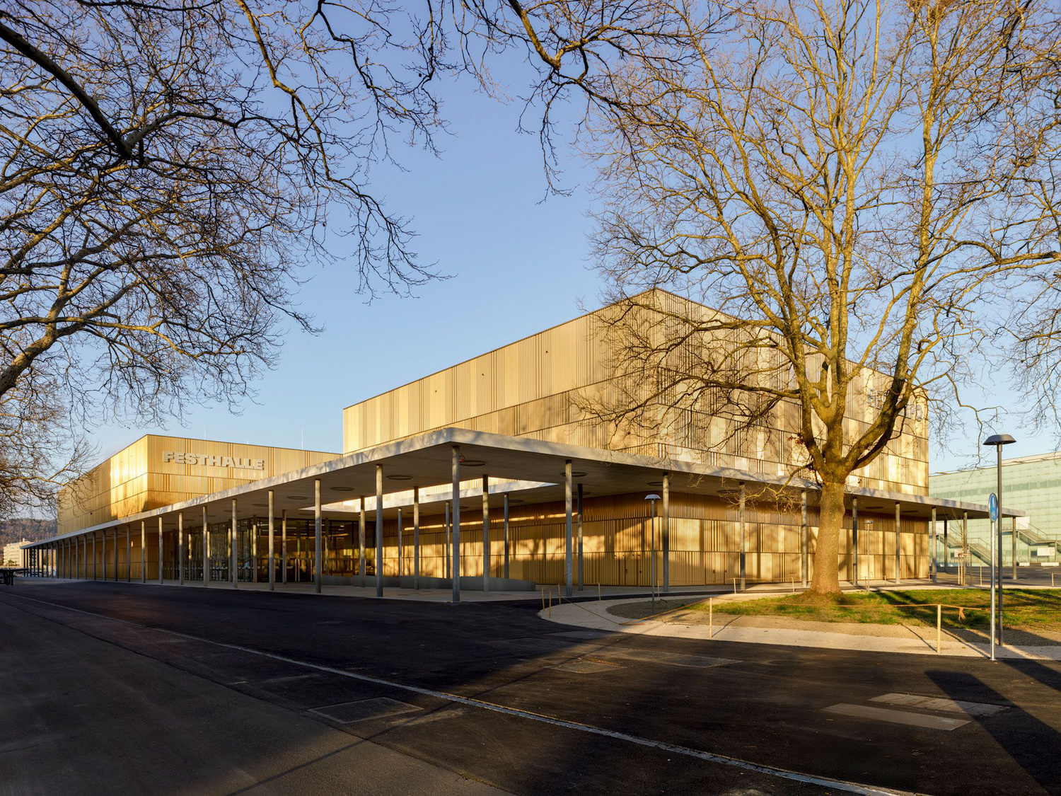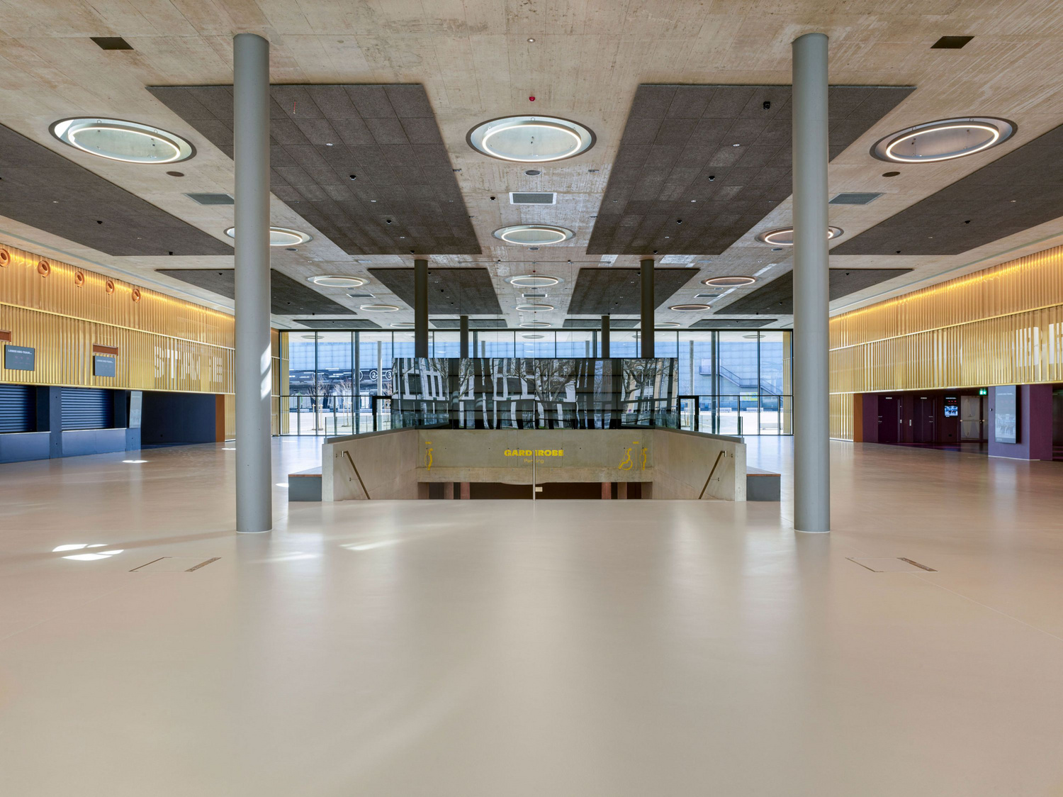 The newbuild comprises two main spaces: a 47 x 42m events venue and an 82 x 58m multipurpose hall. They are at once separated structurally, physically and acoustically by a central foyer and linked in terms of circulation by the light and airy, canopied arcade. A basement connects all three interior spaces to the adjacent car park and so ensures optimum operational functionality.