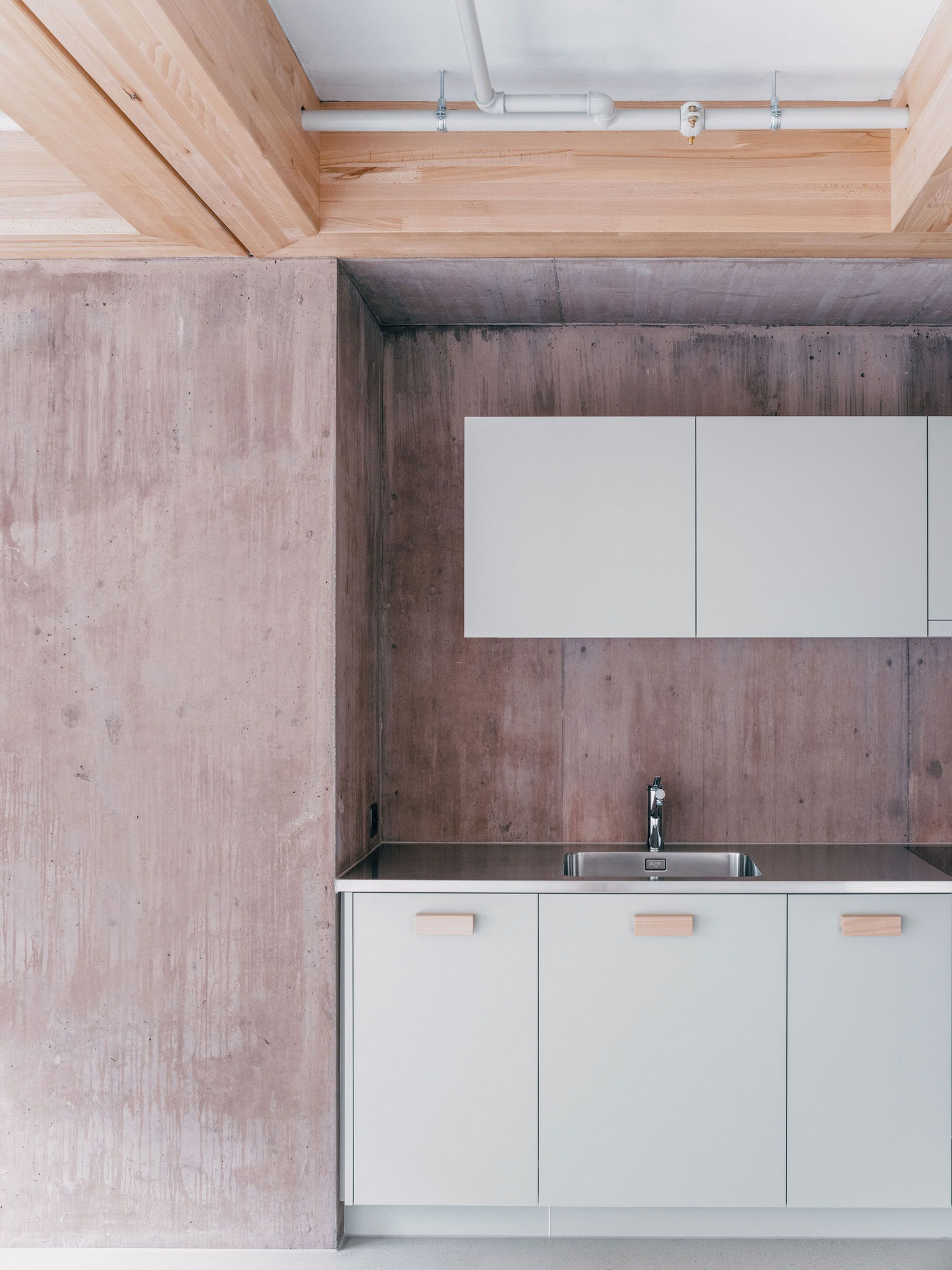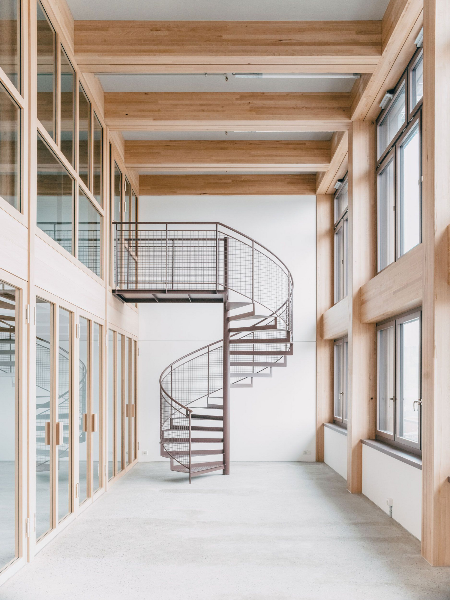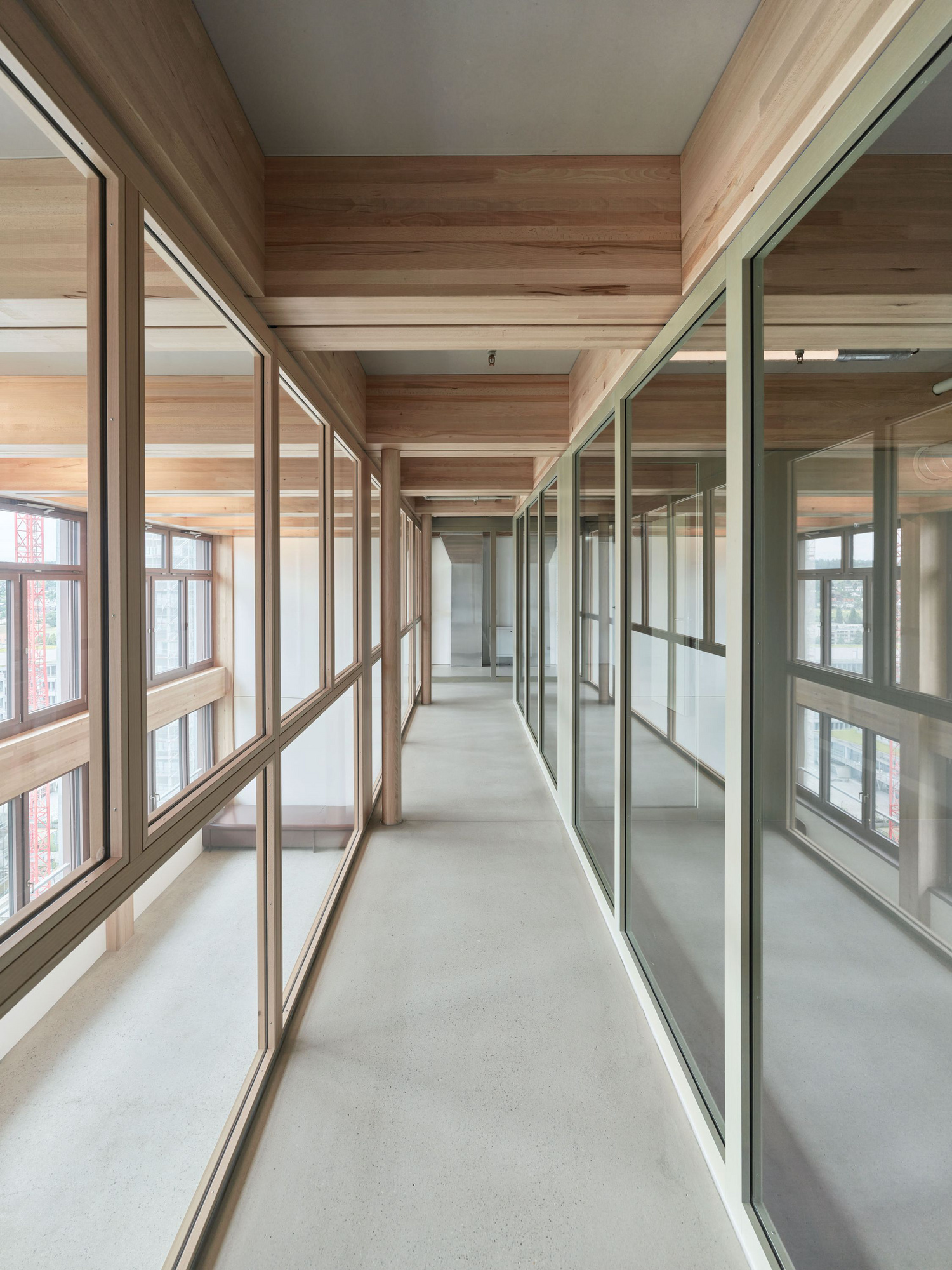 The hybrid design of the upper floors employs a composite timber-concrete system set on solid timber columns in a reduced column grid. Vertical circulation and horizontal reinforcement are provided by the central reinforced concrete core, which combines with the high elongation resistance of the composite timber-concrete slabs to ensure that horizontal wind and seismic loads are transferred efficiently to the ground. The core walls run right down to foundation level, where they are clamped into the basement structure.